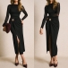 Elegant Crew Neck Gauze Spliced Long Sleeve Side Slit Metal Button Bodycon Midi Dress