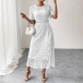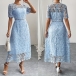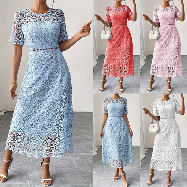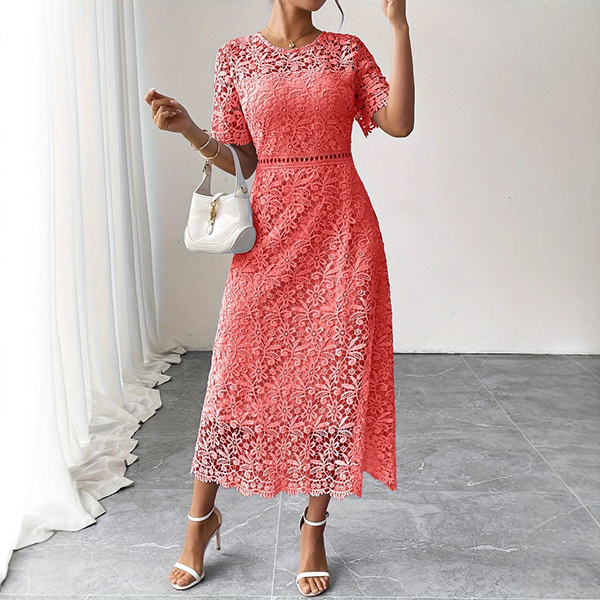 Elegant Crew Neck Lace A-Line Dress with Hollow-Out Waist and Scalloped Hem