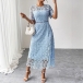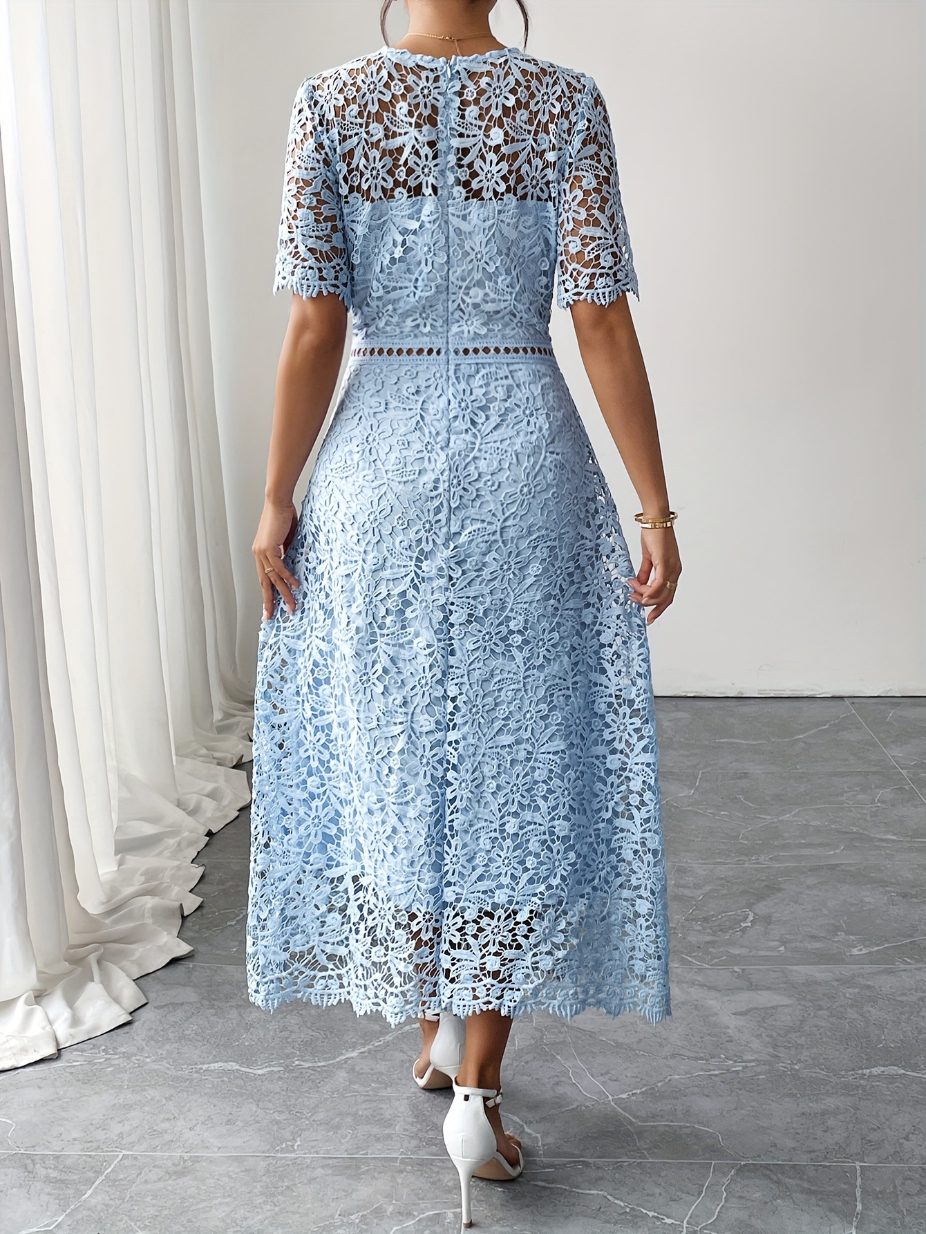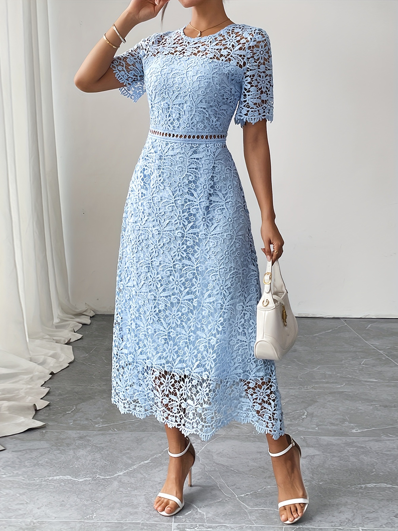 Step into sophistication with this breathtaking lace dress, designed to make you feel effortlessly feminine. Crafted from intricate floral lace in a serene pastel blue, this piece is a timeless addition to your formal wardrobe.