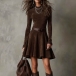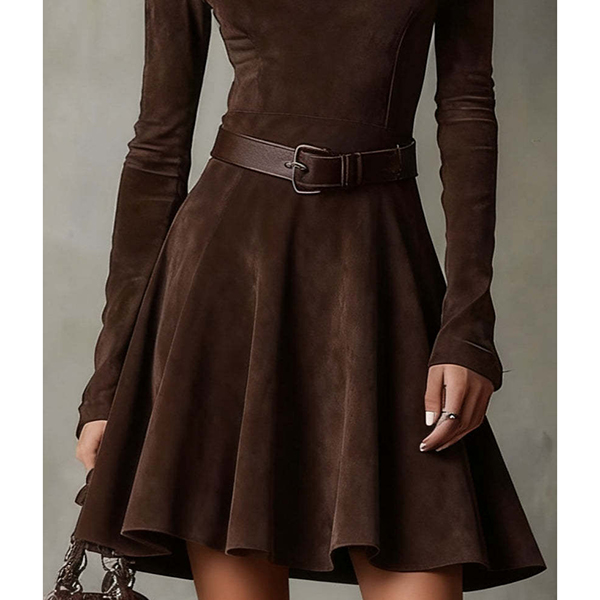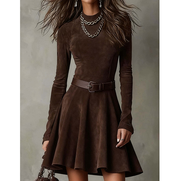 Elegant Crew Neck Long Sleeve A-line Dress with Belt