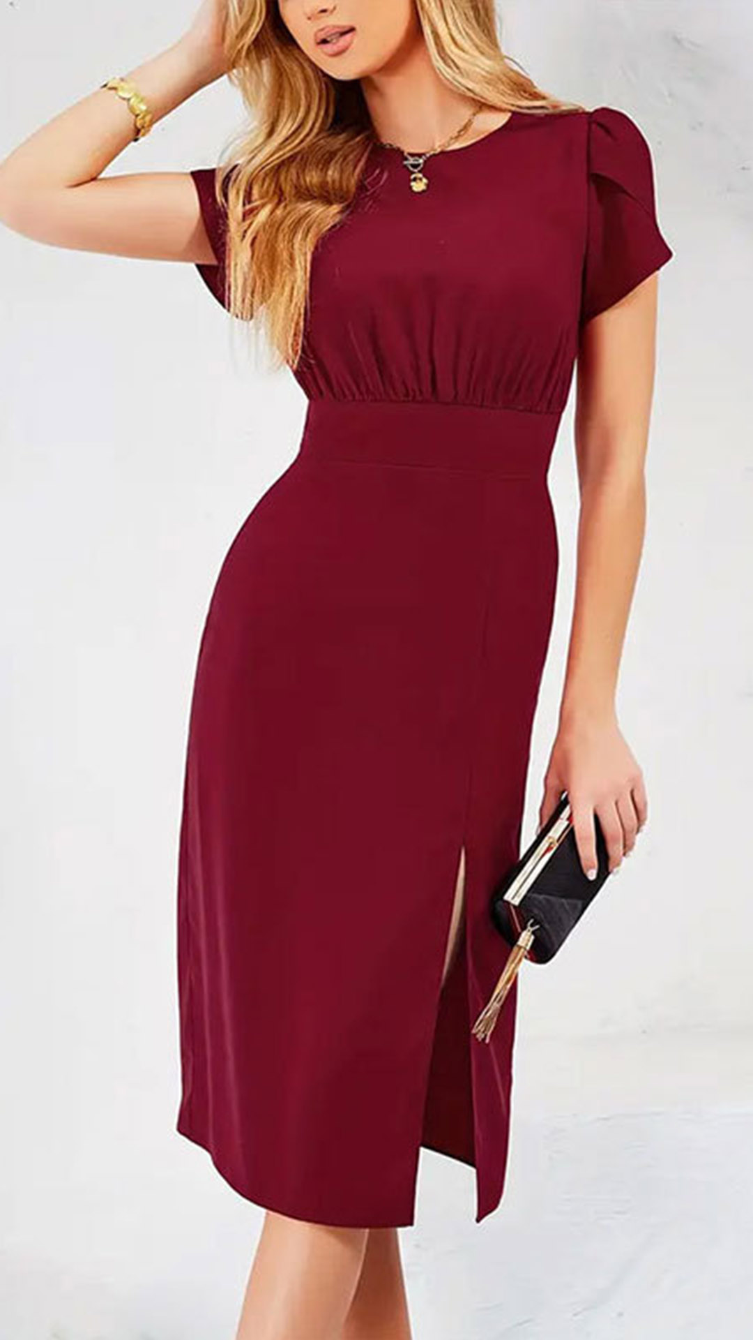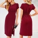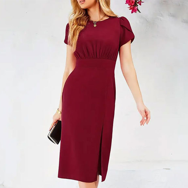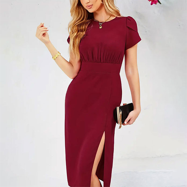 Step out in style with this elegant dress. The crew neck design offers a classic and versatile look, perfect for various occasions. The puff short sleeves add a touch of femininity and sophistication, creating a chic and stylish silhouette. The side slit adds a modern and trendy touch, allowing for movement and a hint of allure. Hope you like it.