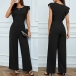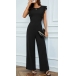 This elegant jumpsuit features a crew neckline, front ruffle detailing, and a sleeveless, straight-cut silhouette for a sophisticated, contemporary look.