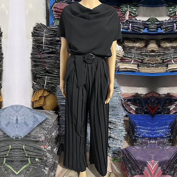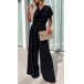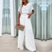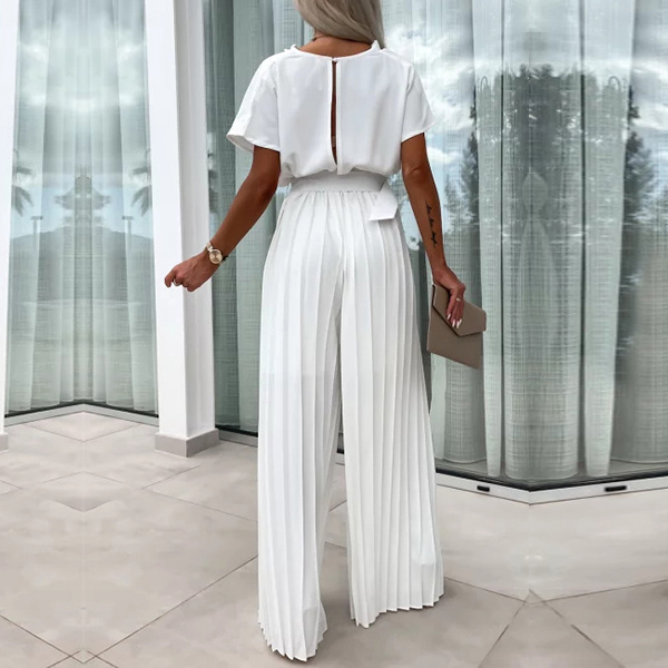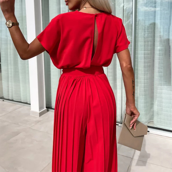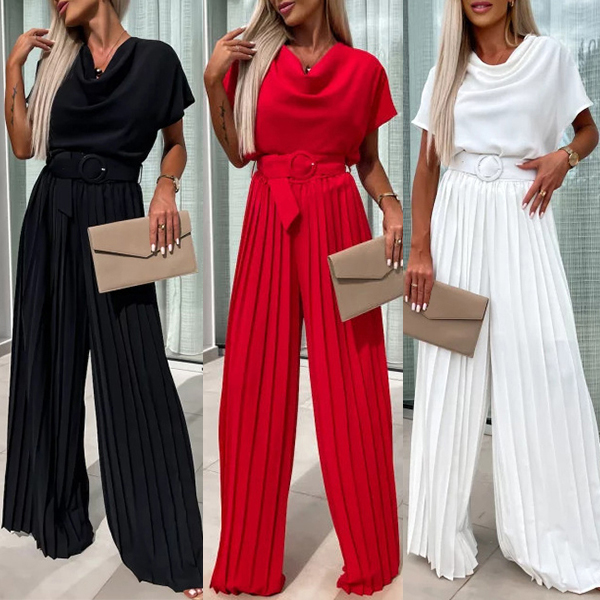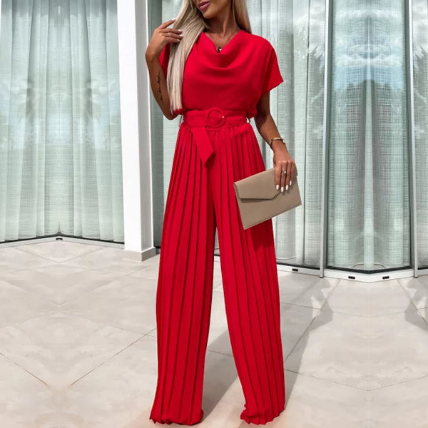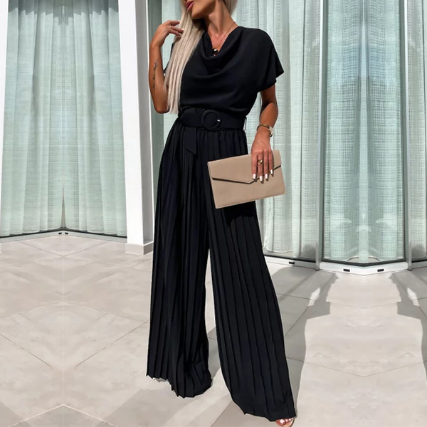 Elegant Draped Neck Short Sleeve Pleated Wide-leg Jumpsuit with Belt