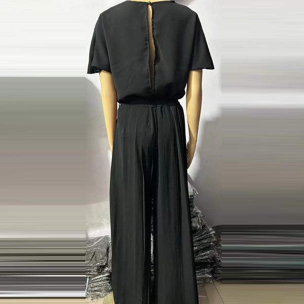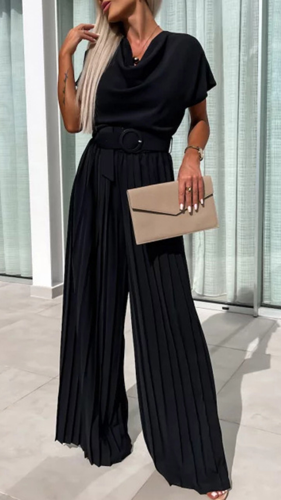 This jumppsuit features a draped neck, short sleeve and pleated wide-leg jumpsuit with a belt. It is a sophisticated and chic piece that is perfect for a special occasion or event.