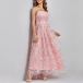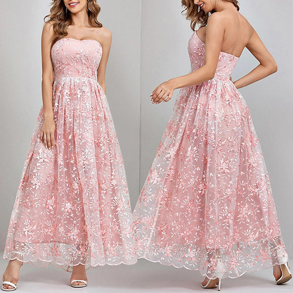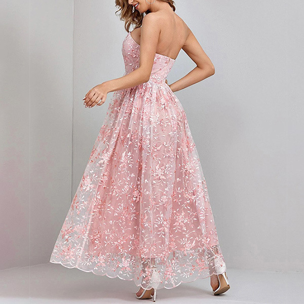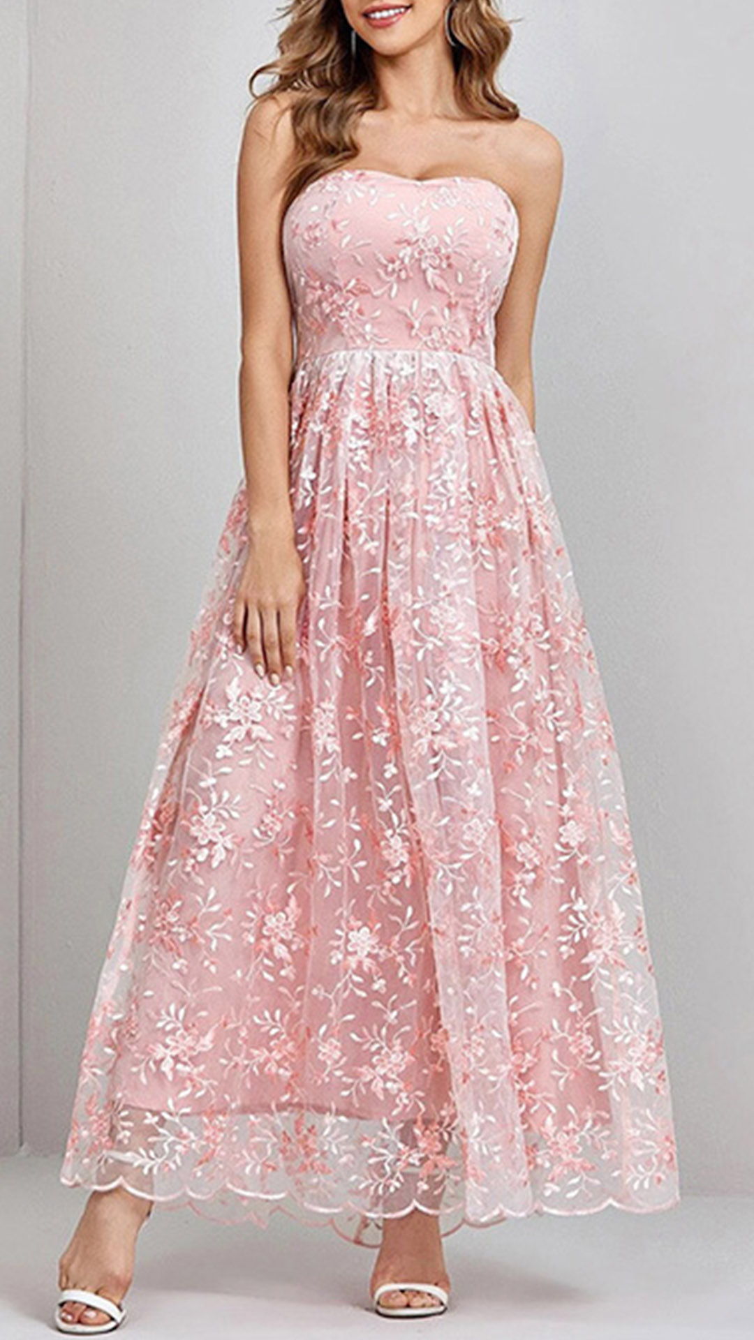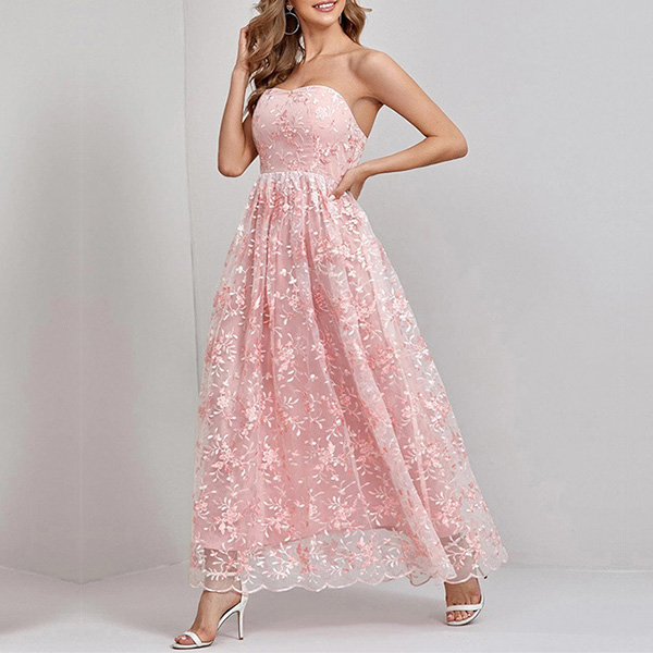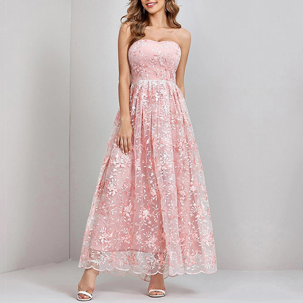 Elegant Floral Embroidery Strapless High-rise Gauze Spliced Pink Party Dress