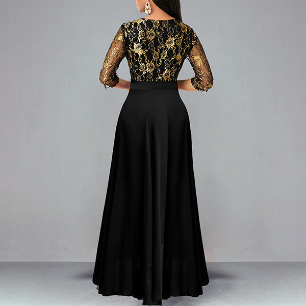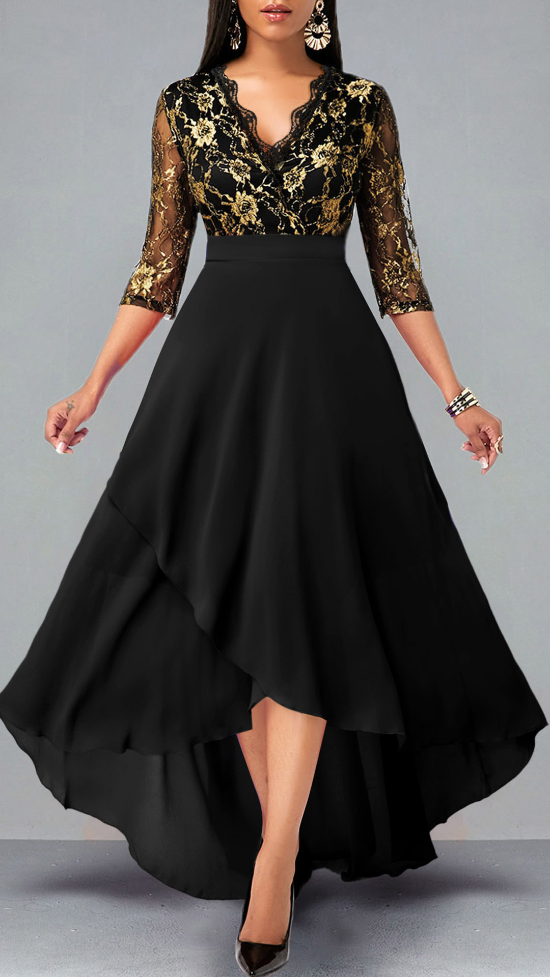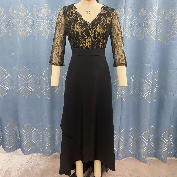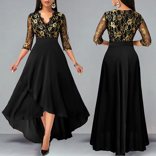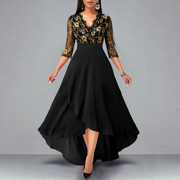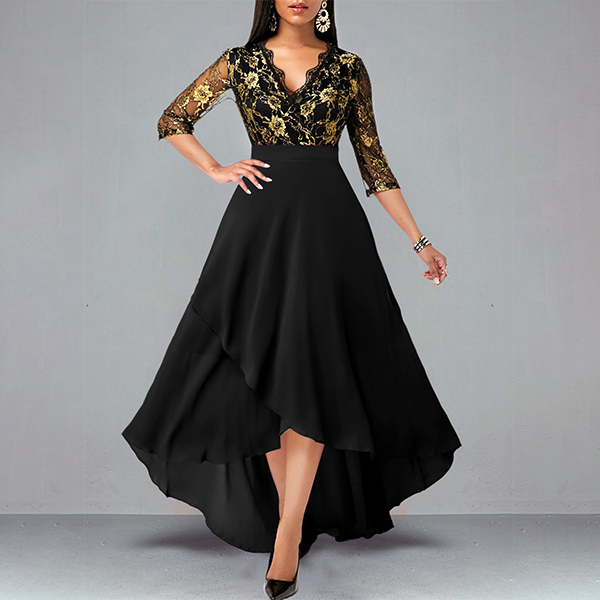 How about this party dress? The delicate floral embroidery adds a touch of elegance and sophistication, making it perfect for formal occasions or cocktail parties. The V-neck design is flattering and feminine, while the elbow-length sleeves provide coverage and add a touch of class. The irregular hemline adds a unique and stylish touch to the overall design, making this dress stand out from the rest. It is a made-to-be-notice dress!