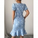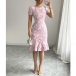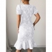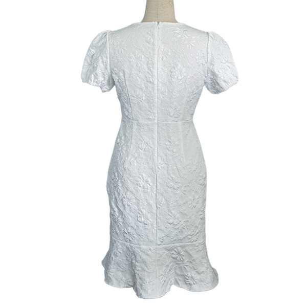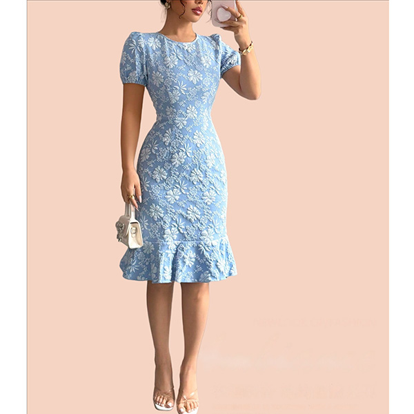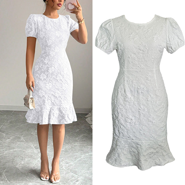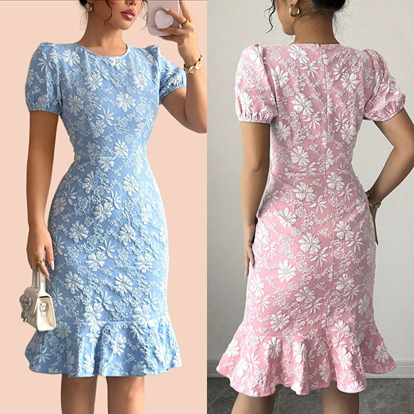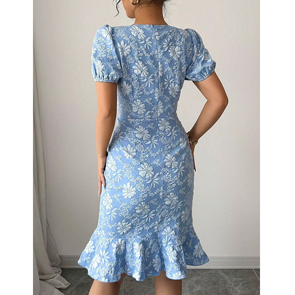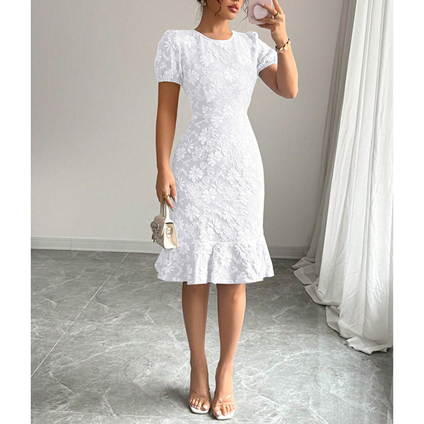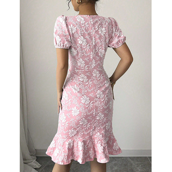 Elegant Floral Jacquard Crew Neck Short Sleeve Ruffle Hemline Bodycon Dress