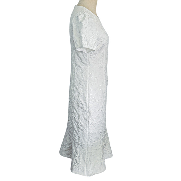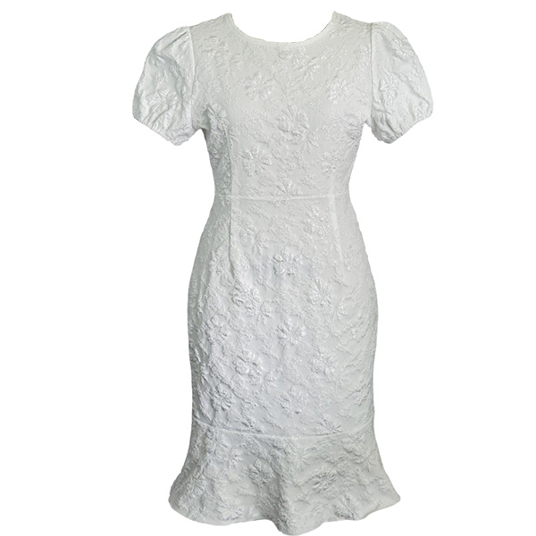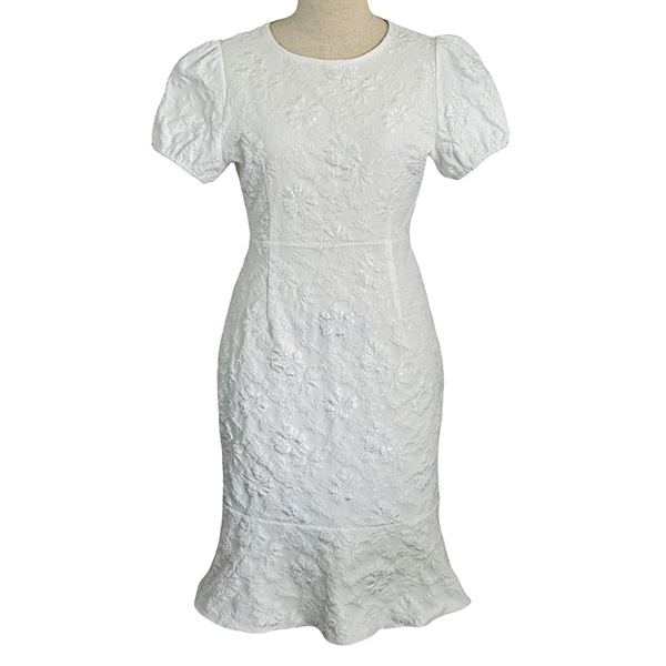 Exude sophistication with this bodycon dress! Featuring a beautiful floral jacquard pattern, this dress offers a timeless appeal. The crew neckline and short sleeves provide a classic touch, while the ruffle hemline adds a playful flair. Pair it with heels and statement accessories for a polished look.