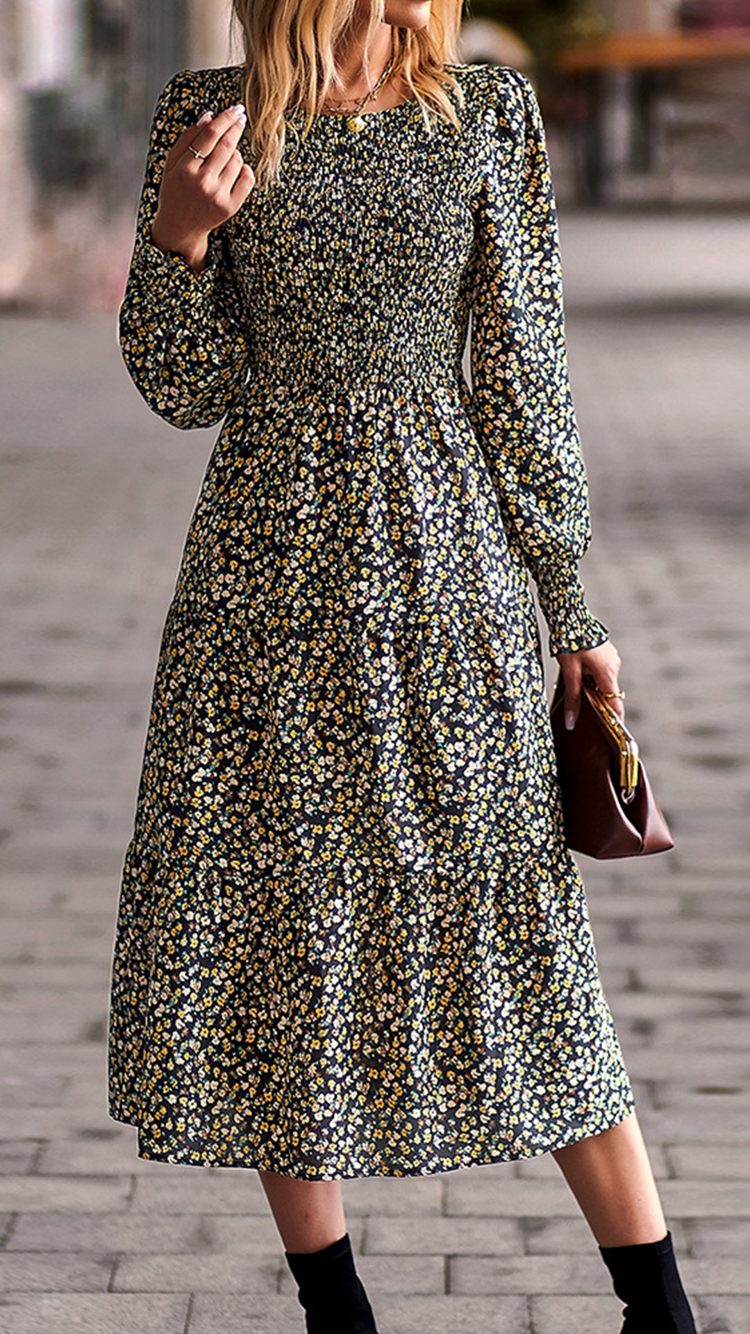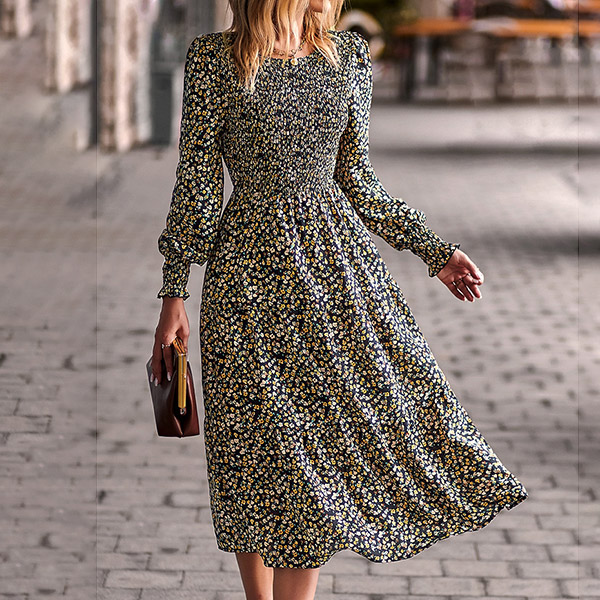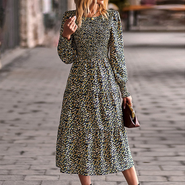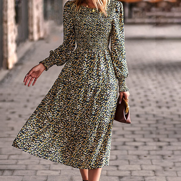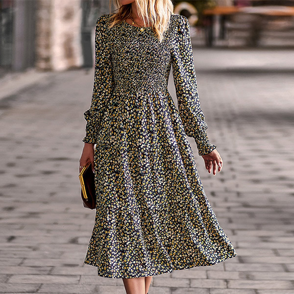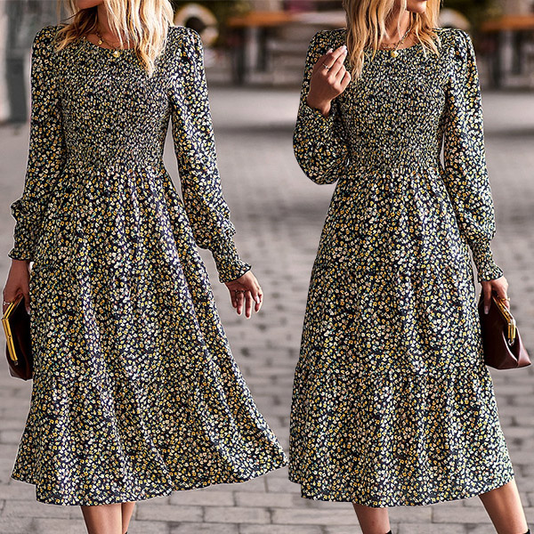 Whether you're looking for a dress to wear to a special occasion or just want to add a touch of style to your everyday wardrobe, this Elegant Floral Printed Round Neck Long Sleeve Midi Dress is the perfect choice. The beautiful floral print is sure to turn heads, while the round neck and long sleeves provide a classic silhouette. The midi length is perfect for any occasion, from a casual day out to a formal event.