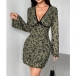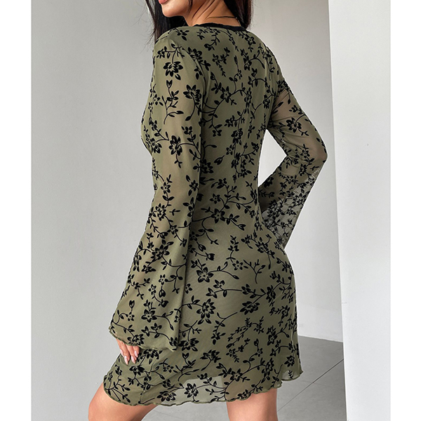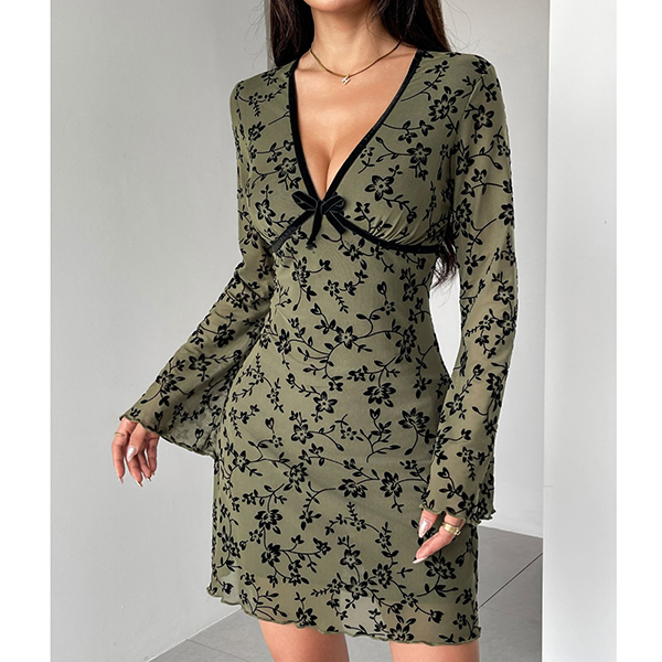 Elegant Floral Printed V-neck Flared Long Sleeve Mini Dress