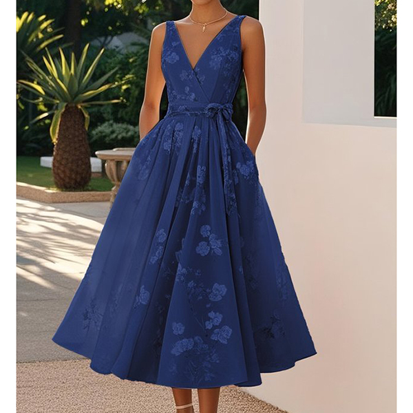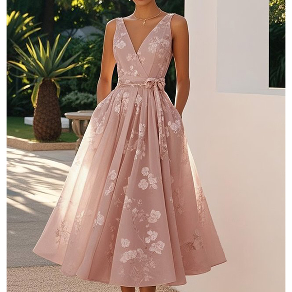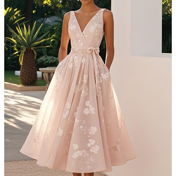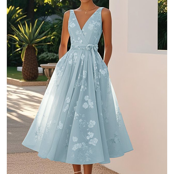 Elegant Floral Printed V-neck Sleeveless Self-tie Party Dress