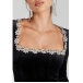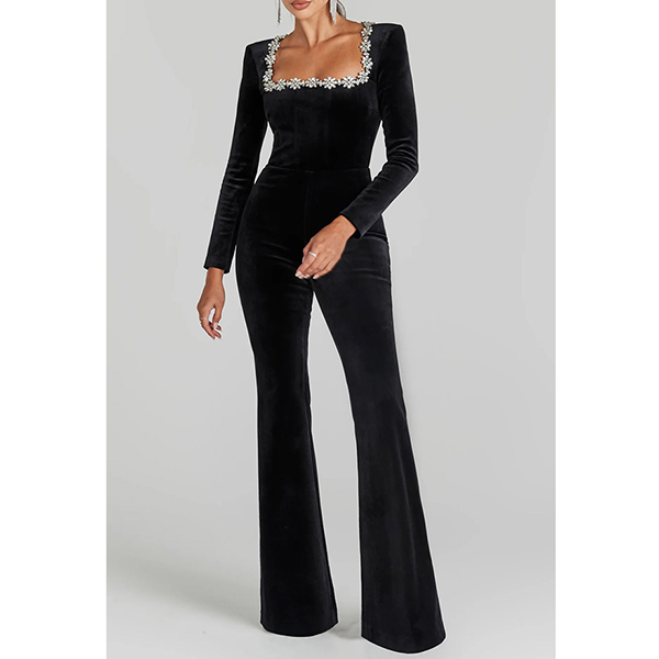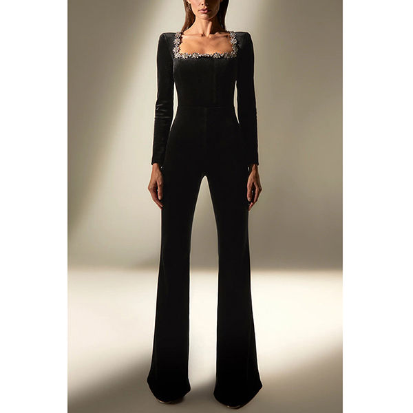 This luxurious jumpsuit features sophisticated square neck styling with exquisite floral rhinestone embellishments and streamlined straight-cut silhouette for contemporary glamorous elegance. Is it your style?