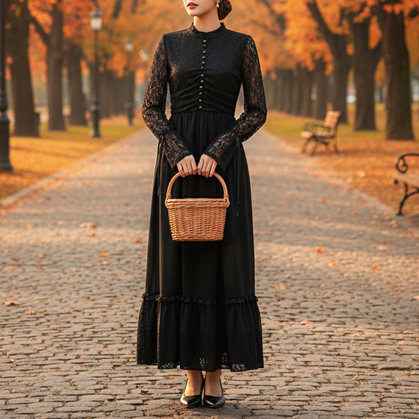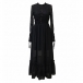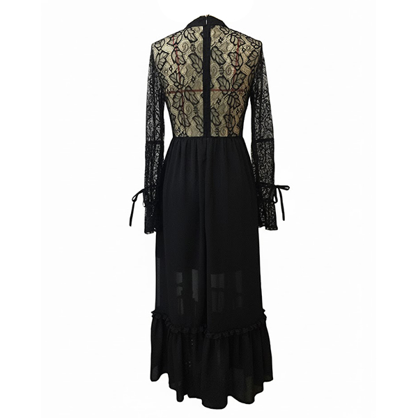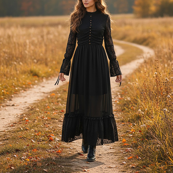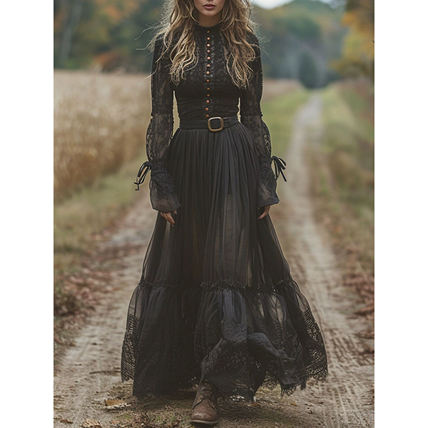 Elegant Front Button Long Sleeve Lace Spliced Maxi Dress (without Belt)