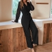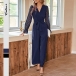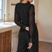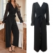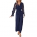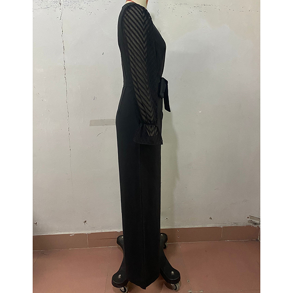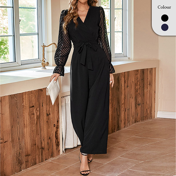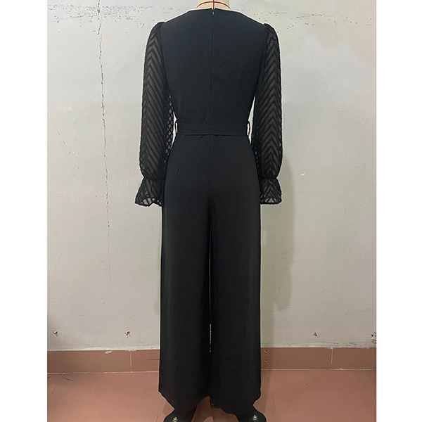 Elegant Gauze Spliced Long Sleeve V-neck Self-tie Straight-cut Jumpsuit