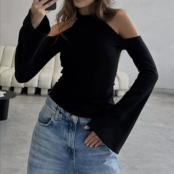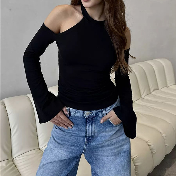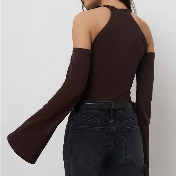 This shirt features halterneck styling with alluring cold shoulder design and dramatic bell sleeves for modern elegant appeal. Wanna have a try? Pari with high-rise bottom for fashion daily wear.