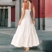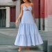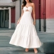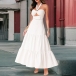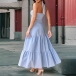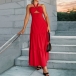 Élégante robe longue dos nu à volants, décolleté cœur et découpes frontales