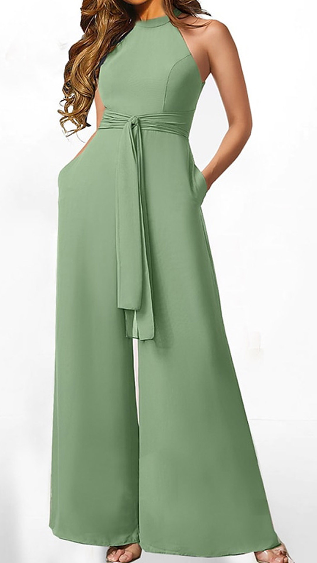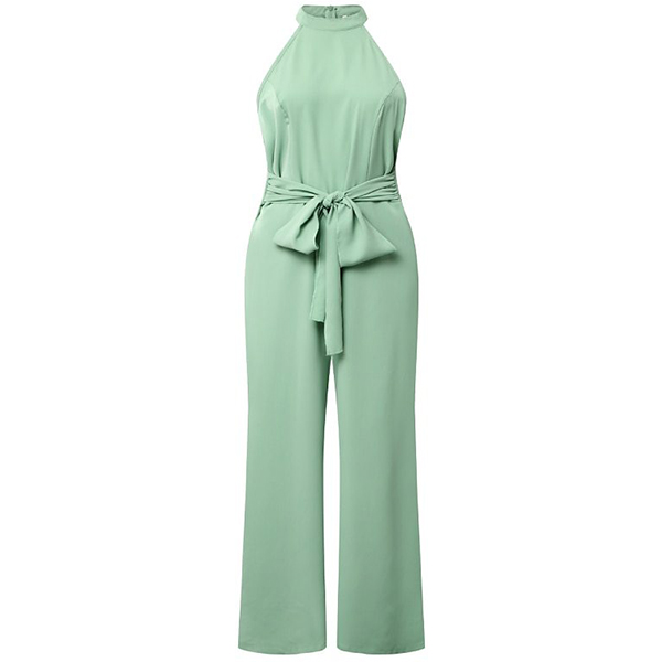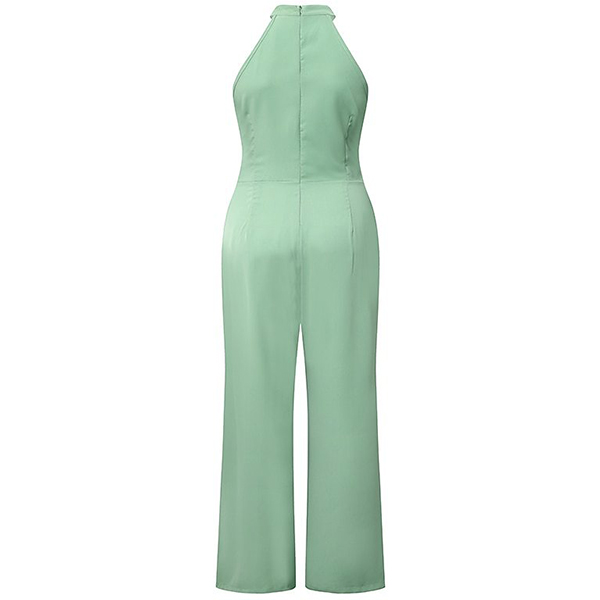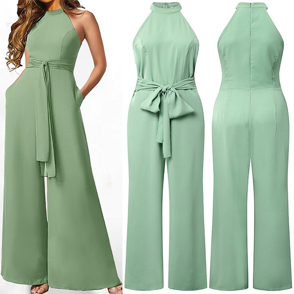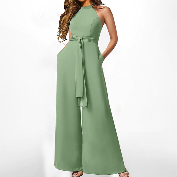 This jumpsuit features a sophisticated halter neckline, a sleeveless design, a flattering straight-cut silhouette, and a self-tie waist, creating a polished and chic look for various occasions. You could layer it with a blazer or jacket for a more polished and versatile outfit.
