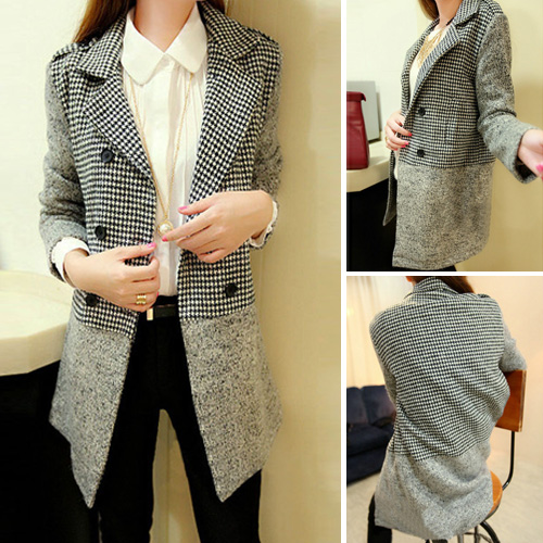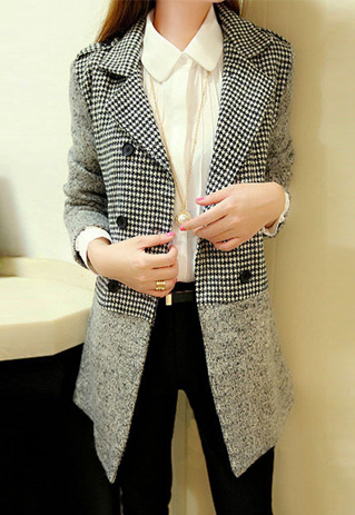 When you first time to see this coat,you will can't wait to want to buy it. It features Houndstooth pattern,fashion and popular. Sleeve and hemline with knitting spliced design,unique and chic. Slim fit design. Perfect show your elegant temperament and slender figure.