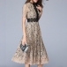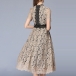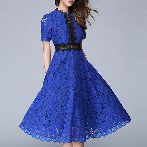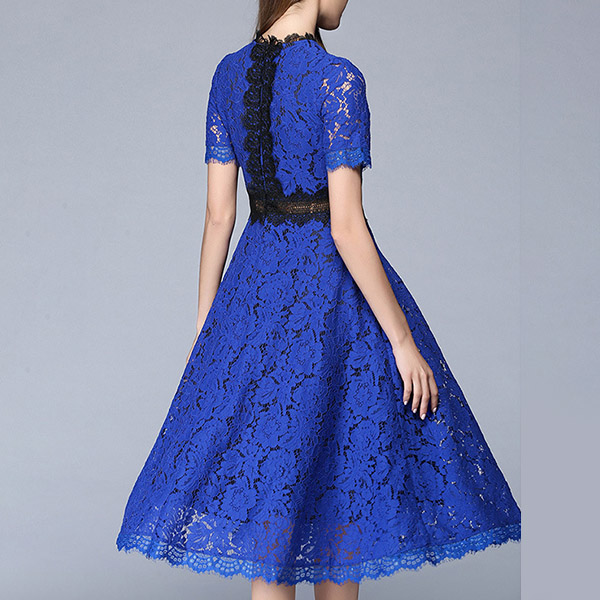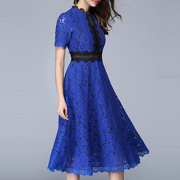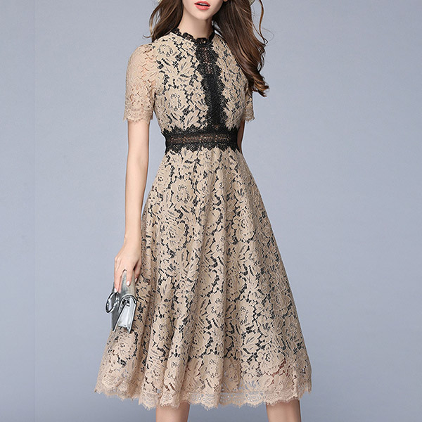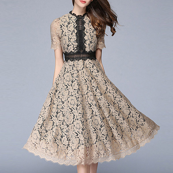 Elegant Jacquard Round Neck Short Sleeve High-rise Midi Lace Dress