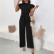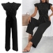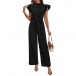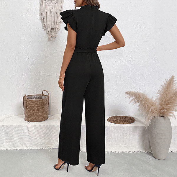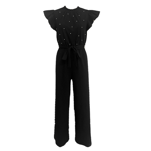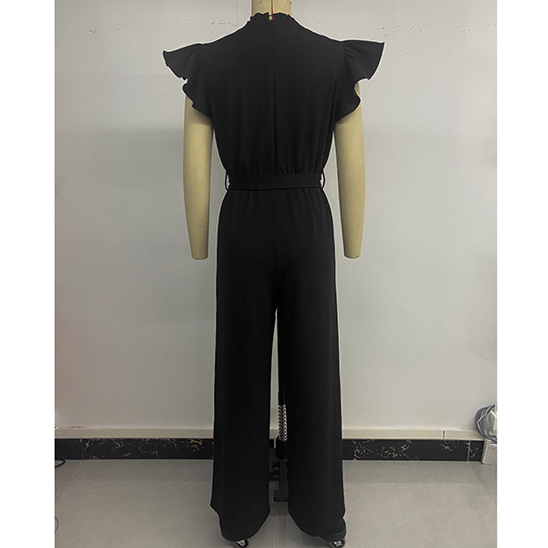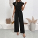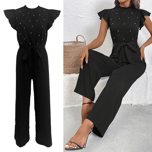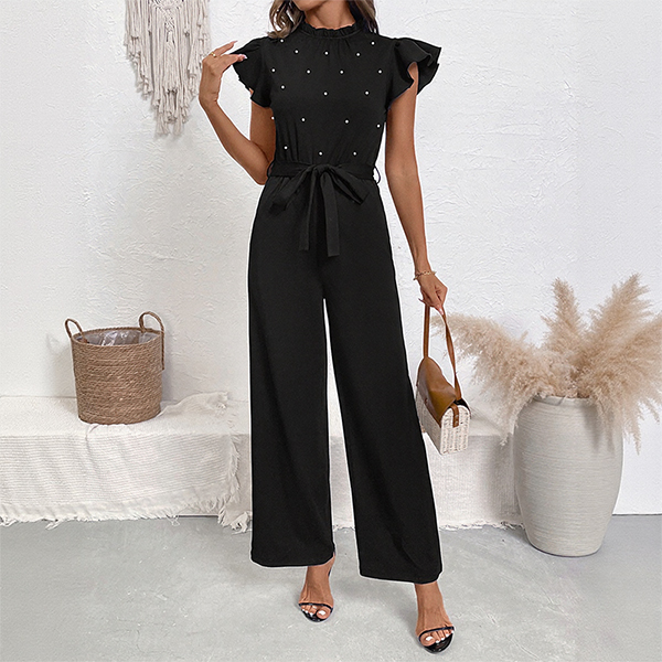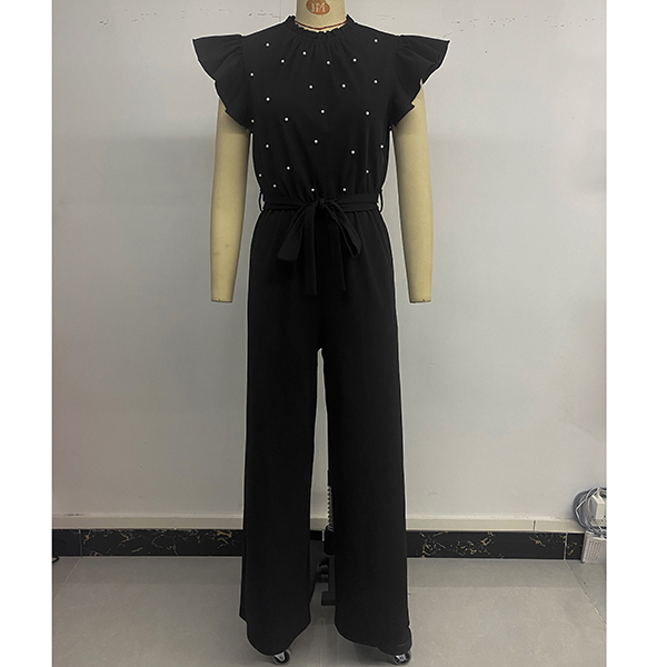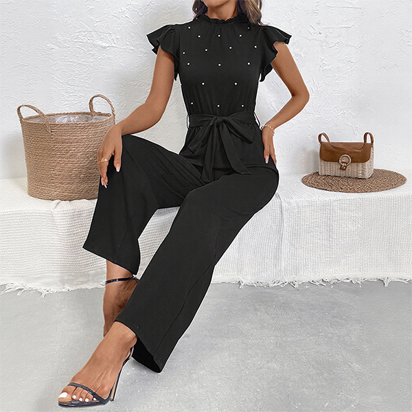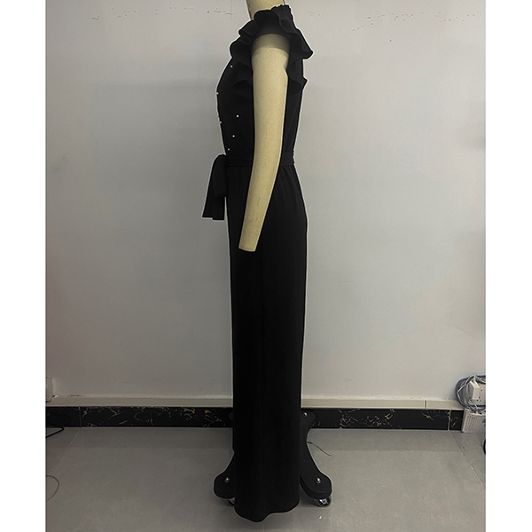 Fashion Beaded Ruffle Round Neck Sleeveless Self-tie Straight-cut Jumpsuit