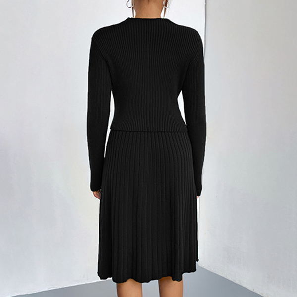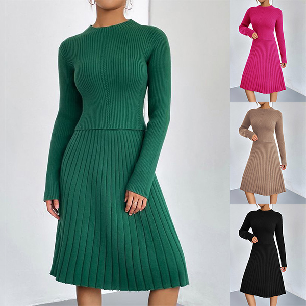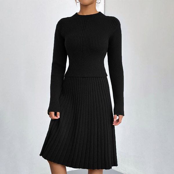 Elegant Knitted Ribbed Two-piece Set Consist of Round Neck Sweater and Skirt