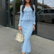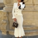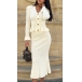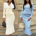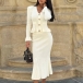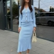 Make a sophisticated statement with this Elegant Knitted Two-piece Set. It consists of a Ruffle Cardigan and Fishtail Skirt. This chic set features a beautifully crafted knitted fabric that exudes elegance and style. The ruffle cardigan adds a touch of femininity and charm, while the fishtail skirt creates a flattering and graceful silhouette. Perfect for a special occasion or a day at the office, this two-piece set offers a polished and put-together look. Color:White,Light Blue,Black, which one do you like?