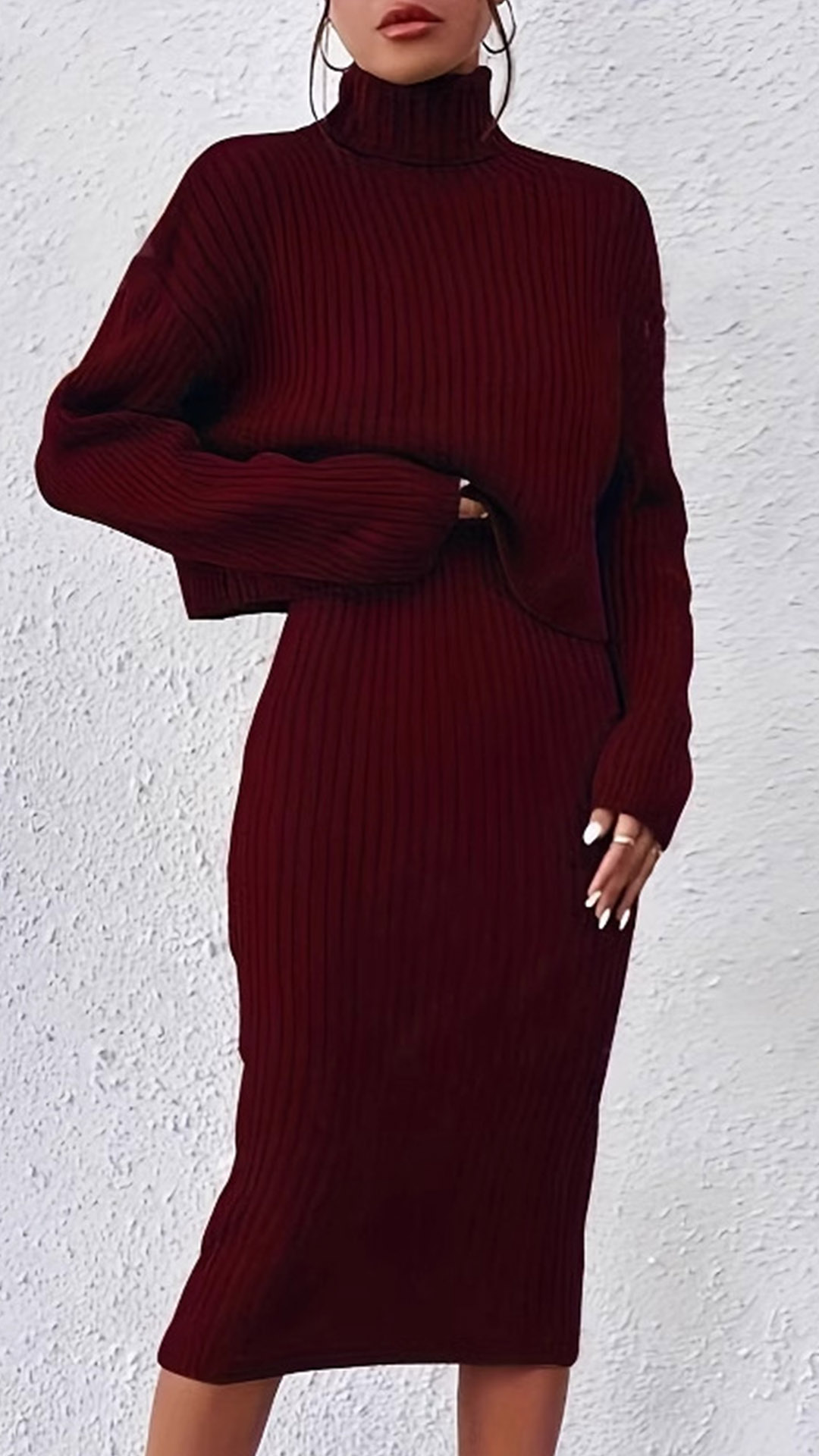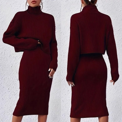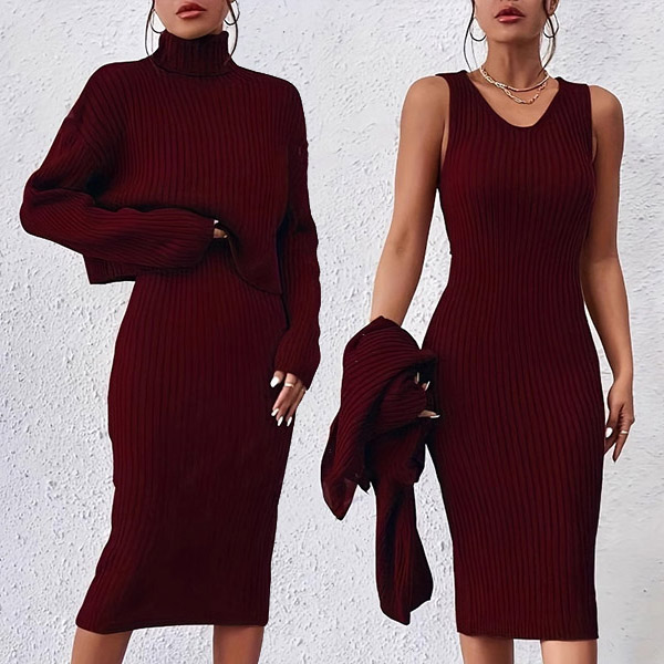 Achieve a sophisticated and versatile look with this Knitted Two-piece Set. It consists of a Turtleneck Sweater and V-neck Tank Dress. This stylish set offers endless outfit options, whether worn together for a coordinated look or mixed and matched with other pieces in your wardrobe.