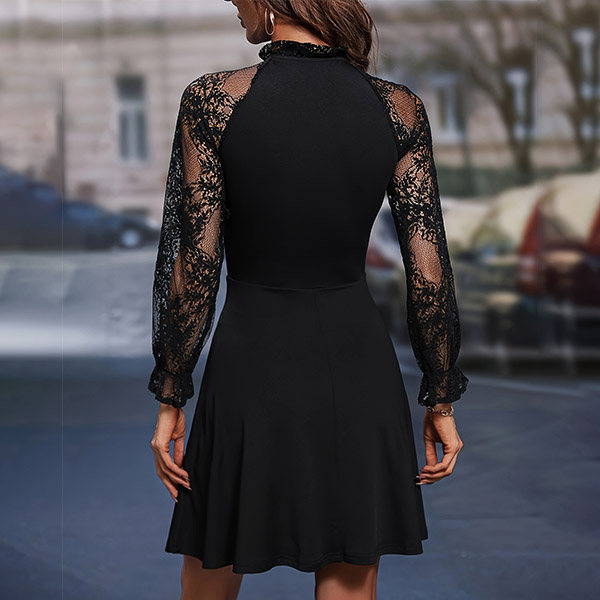 Elegant Lace Spliced Long Sleeve Self-tie Round Neck Cinched Waist Mini Dress