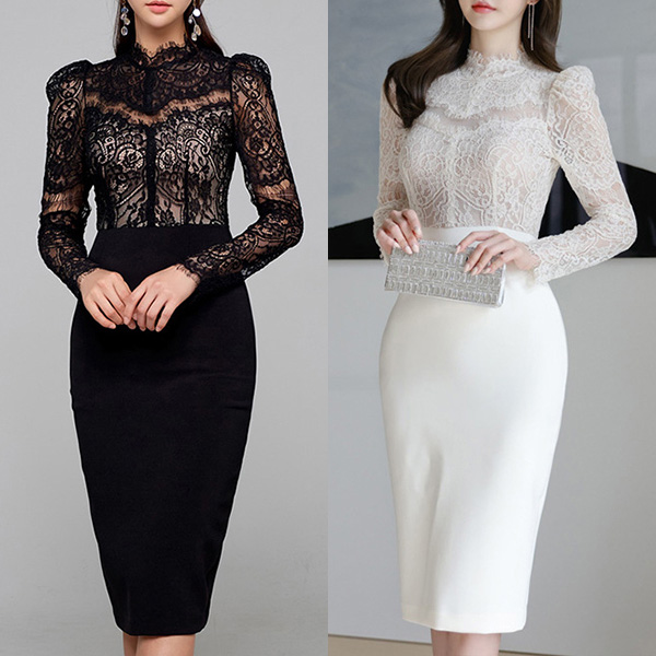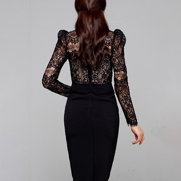 Elegant Lace Spliced Mock Neck Long Sleeve Bodycon Dress