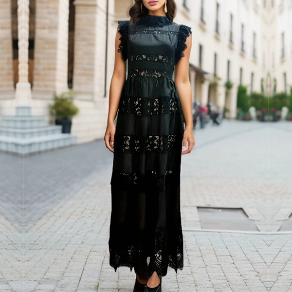 Elegant Lace Spliced Mock Neck Sleeveless Tiered Dress