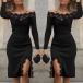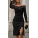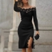 Elegant Lace Spliced Off-the-shoulder Long Sleeve Slit Bodycon Dress