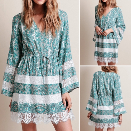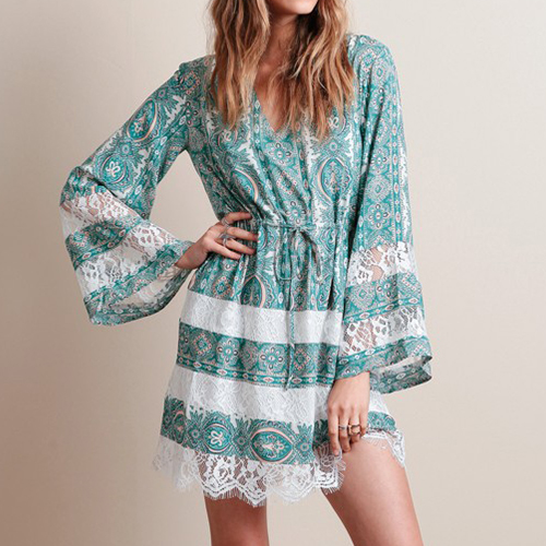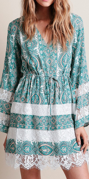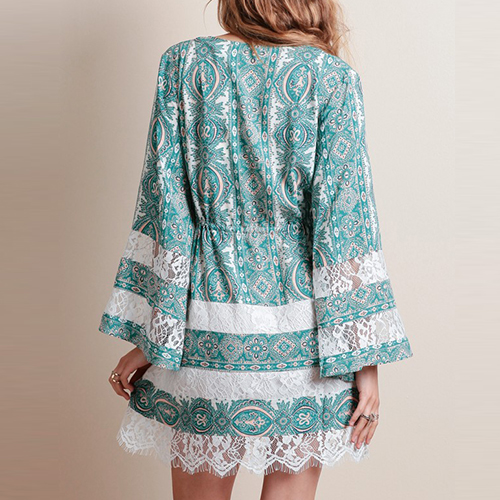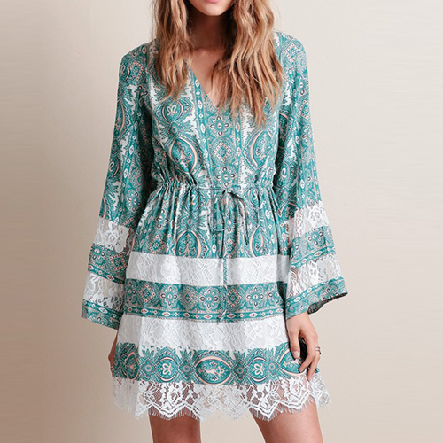 chic printed style, accompanied with lace spliced, v-neck and 3/4 sleeve design, this dress perfect