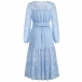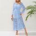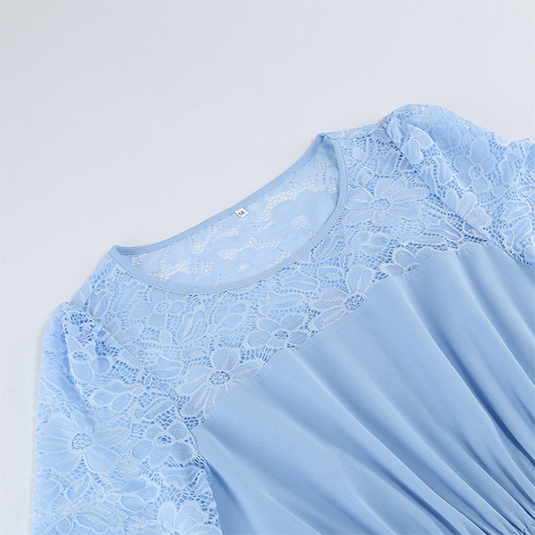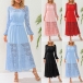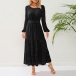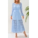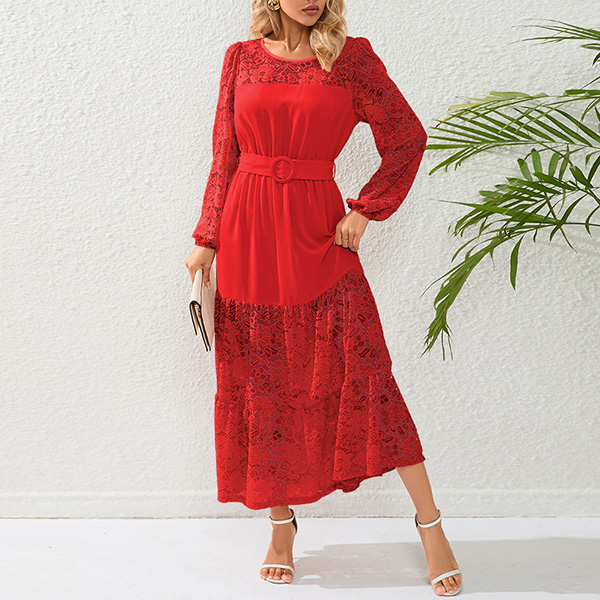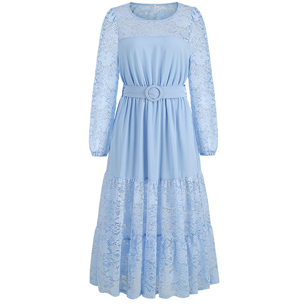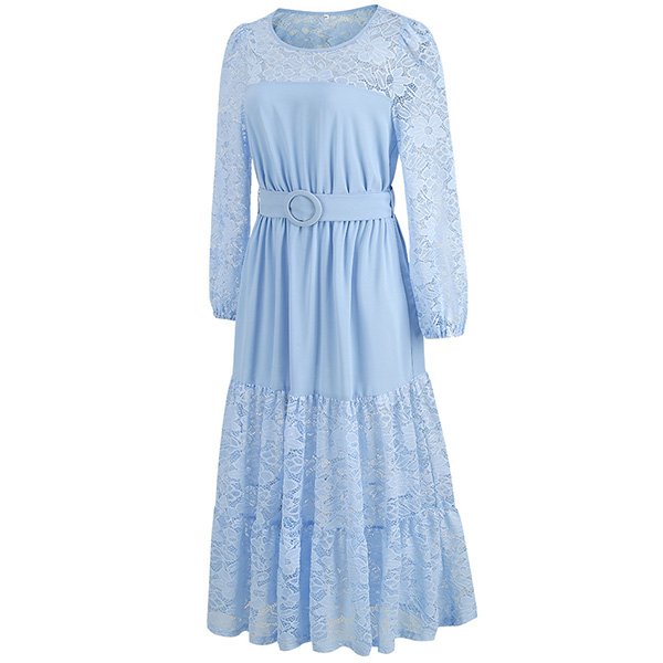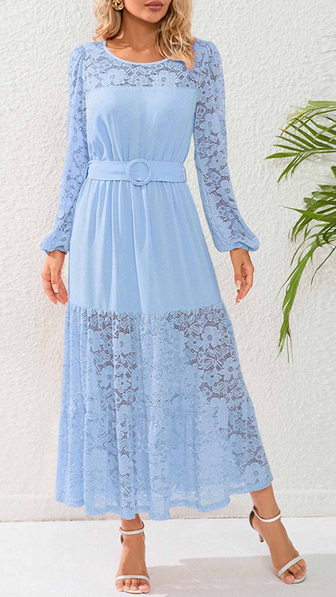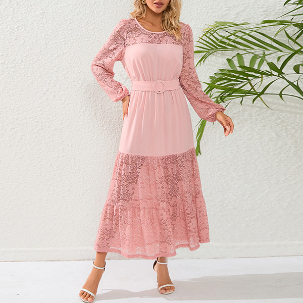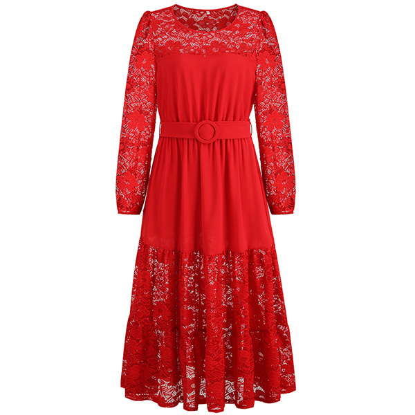 Elegant Lace Spliced Round Neck Long Sleeve Midi Dress with Belt