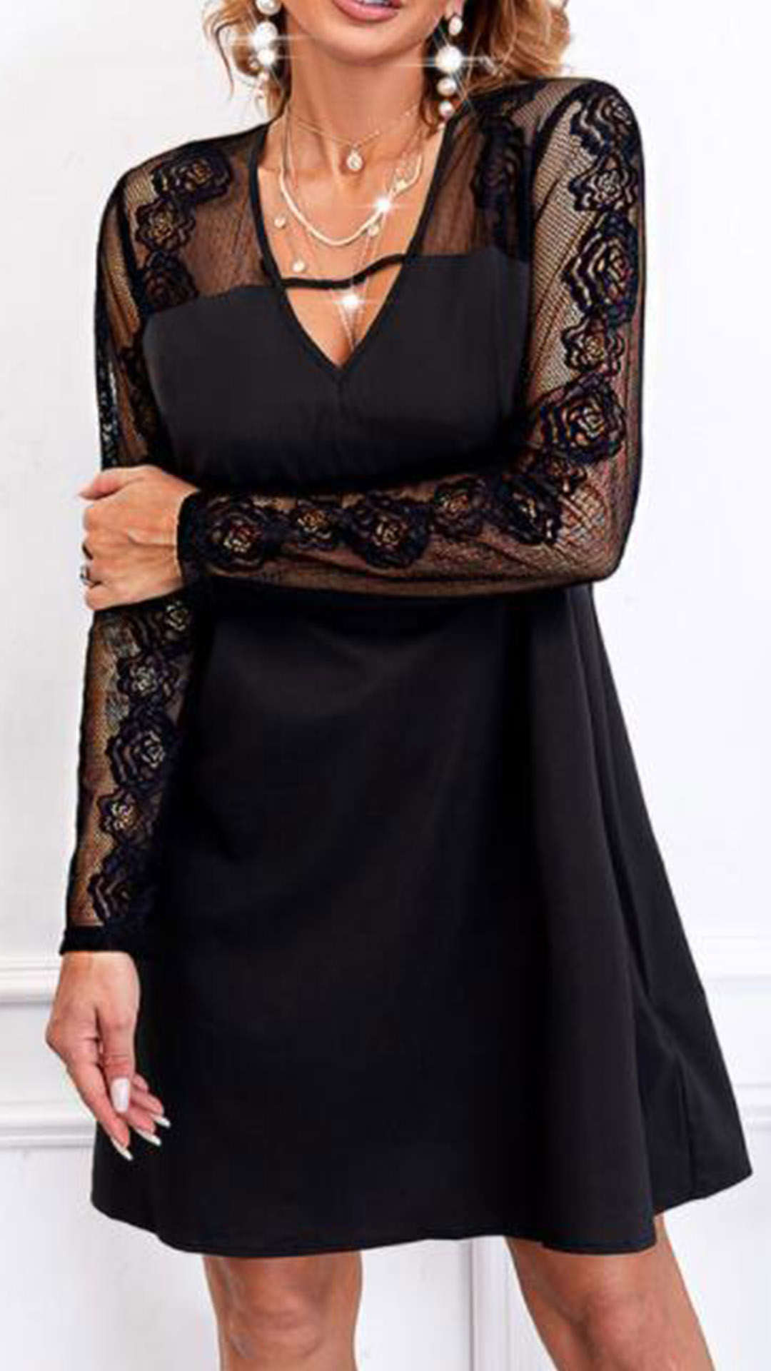Comes with lace spliced long sleeve, and V-neck with strap design, this A-lined looks elegant and chic.