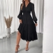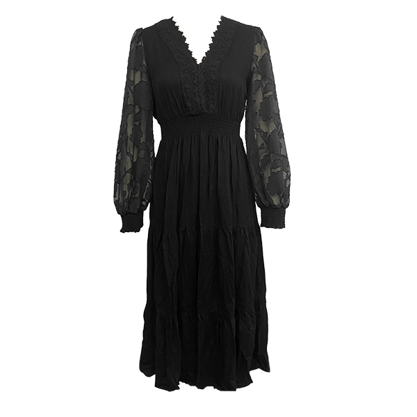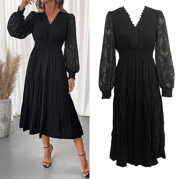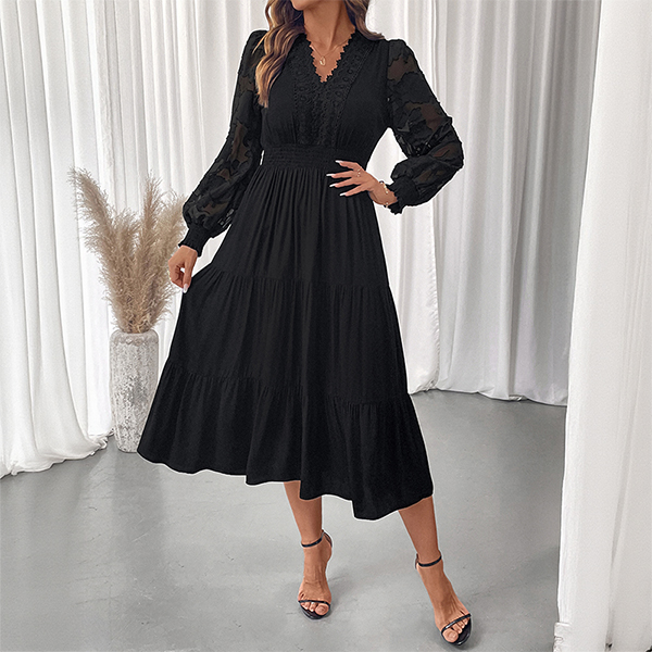 This sophisticated dress features intricate lace panels thoughtfully integrated throughout the design, creating luxurious textural interest and romantic dimension. The flattering V-neckline elegantly frames the décolletage while offering a universally flattering line that elongates the upper body. Long sleeves with delicate lace detailing provide graceful coverage with an air of feminine sophistication. The high-rise waistline accentuates your natural curves at their most flattering point, creating a beautifully defined silhouette. Crafted with meticulous attention to detail, the lace splicing creates architectural interest and visual depth throughout the streamlined design. The versatile midi length offers modern elegance that transitions effortlessly from professional settings to evening occasions. Hope you like it.