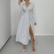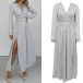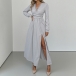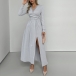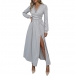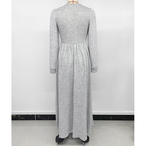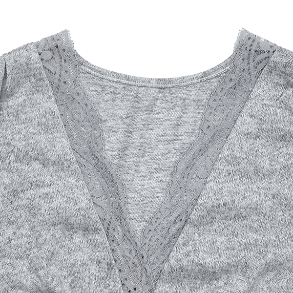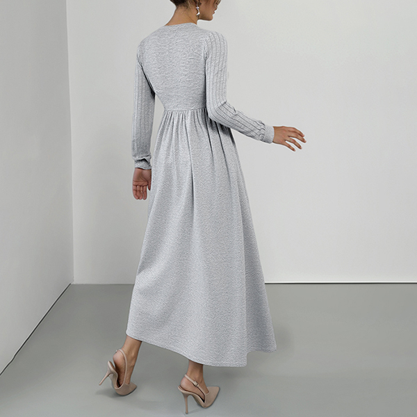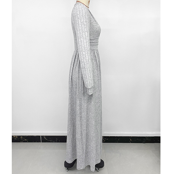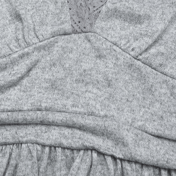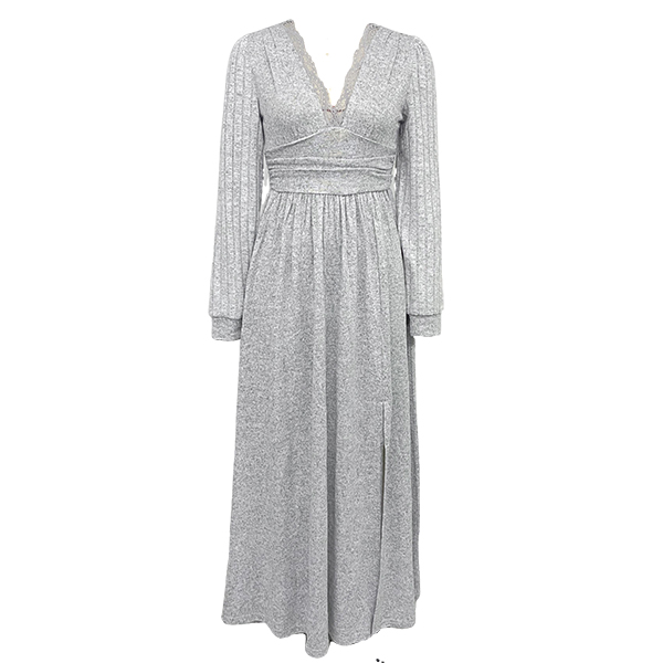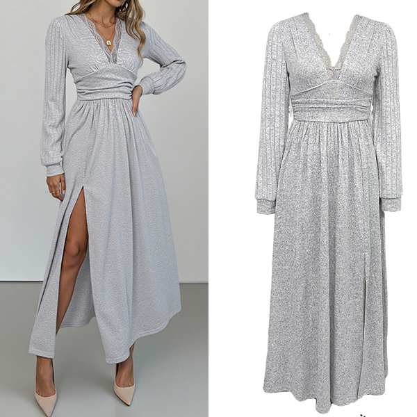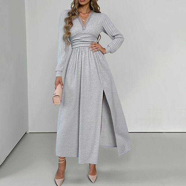 This sophisticated gray dress features delicate lace detailing along the V-neck, and ribbed long sleeve, strategically placed to create visual interest and textural contrast against the smooth base fabric. The high-rise waistline defines your natural silhouette at its narrowest point, creating a figure-enhancing effect. An alluring side slit adds movement and a subtle touch of drama while allowing for comfortable mobility. The versatile gray hue delivers sophisticated neutrality that pairs beautifully with bold accessories or understated elegance. Perfect for daily wear.