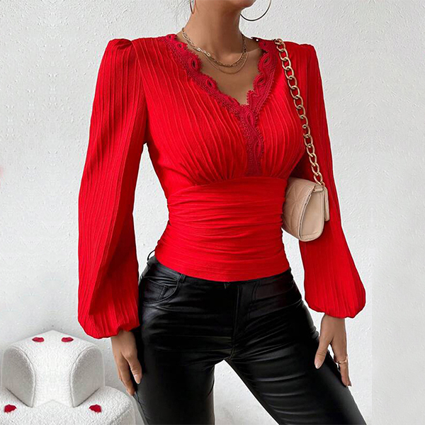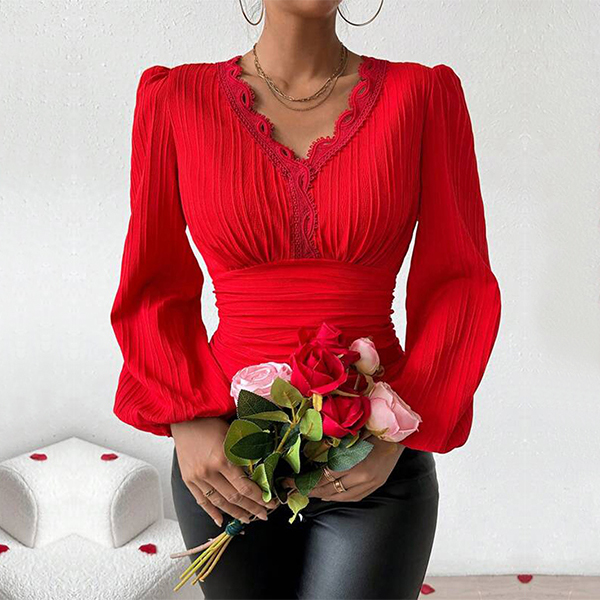 This casual shirt features a lace splicing along the V-neckline, , long sleeves, and a smocked hemline for an elegant and stylish look.