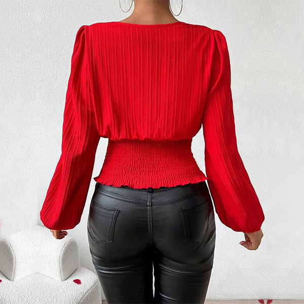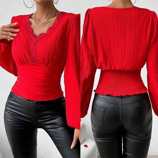 Elegant Lace Spliced V-neck long Sleeve Smocked Hemline Shirt