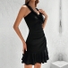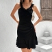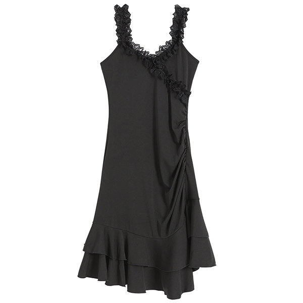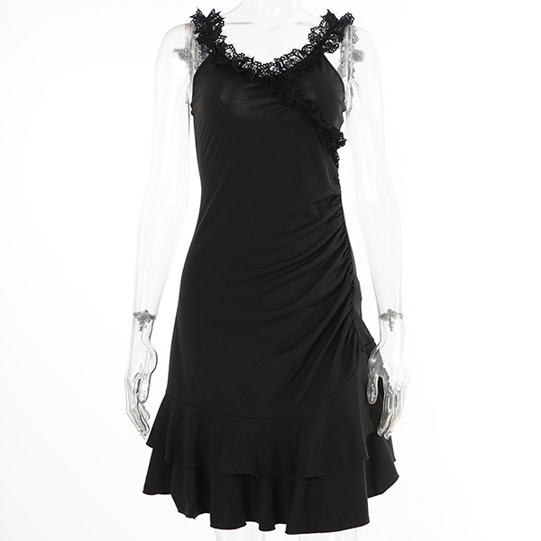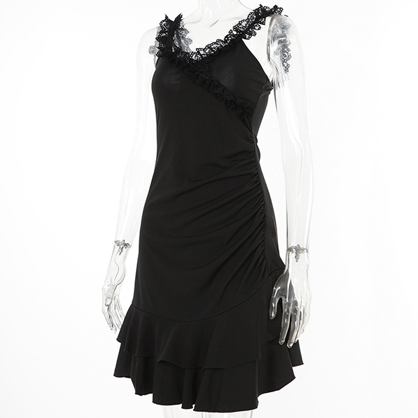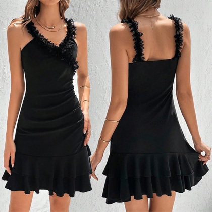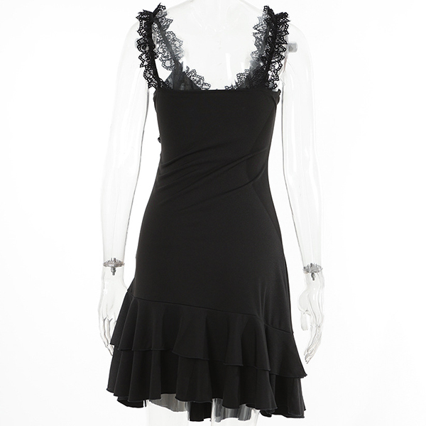 This stunning black dress is the epitome of elegance and style. The lace-spliced V-neckline and shoulder strap brings a hint of romantic charm. The ruffled hemline detailing accentuates your femininity, creating a playful and graceful silhouette. Crafted with attention to detail, this mini black dress is perfect for any special occasion or evening event. Hope you like it.