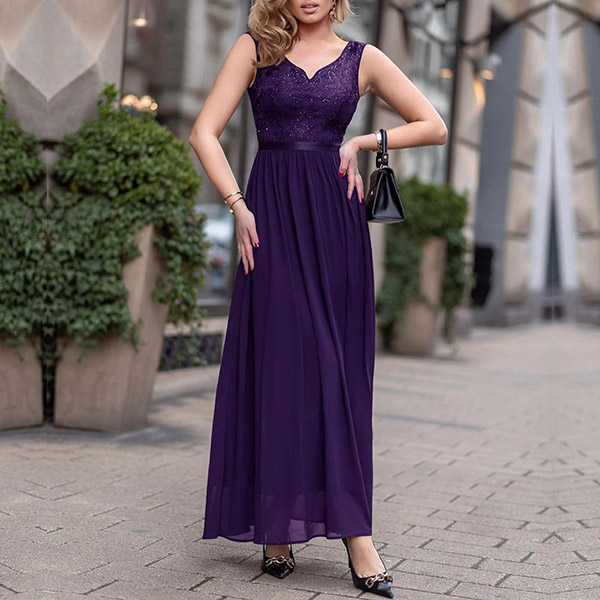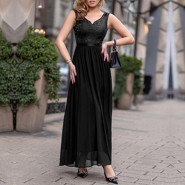 Elegant Lace Spliced V-neck Sleeveless Maxi Dress