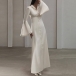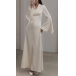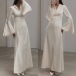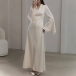 This sophisticated and chic dress is perfect for making a statement at any special occasion. The lapel V-neckline adds a touch of elegance, while the trumpet sleeves provide a dramatic and stylish flair. The front button detailing adds a classic and timeless element to the dress, creating a polished and put-together look. Whether you're attending a formal event, a cocktail party, or a special dinner, this maxi dress is a show-stopping choice that will make you stand out with grace and sophistication.