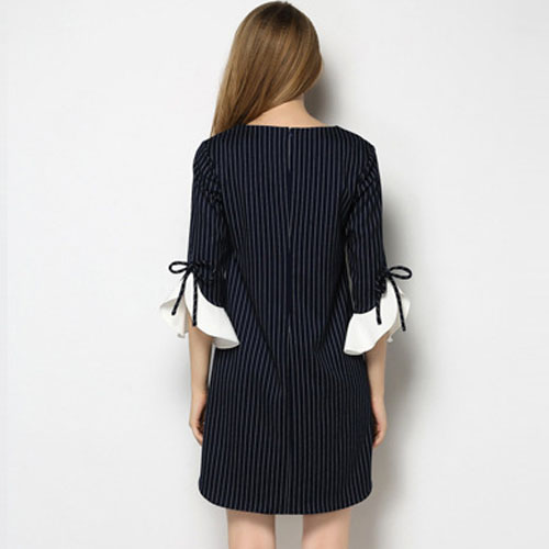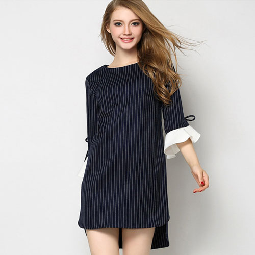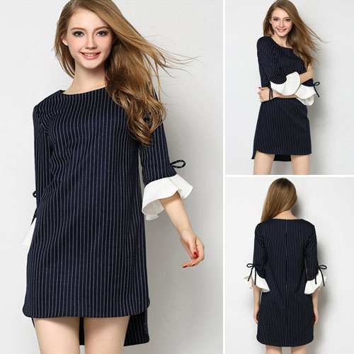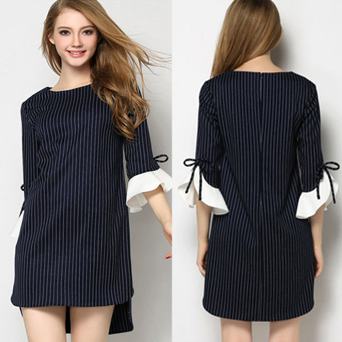 Striped style,with round neck and slim fit design. Chic lotus leaf sleeve design makes