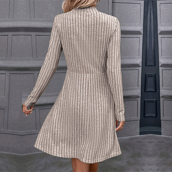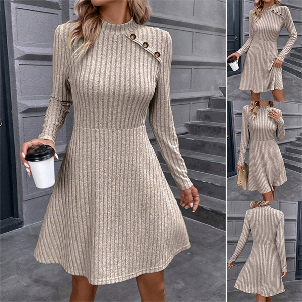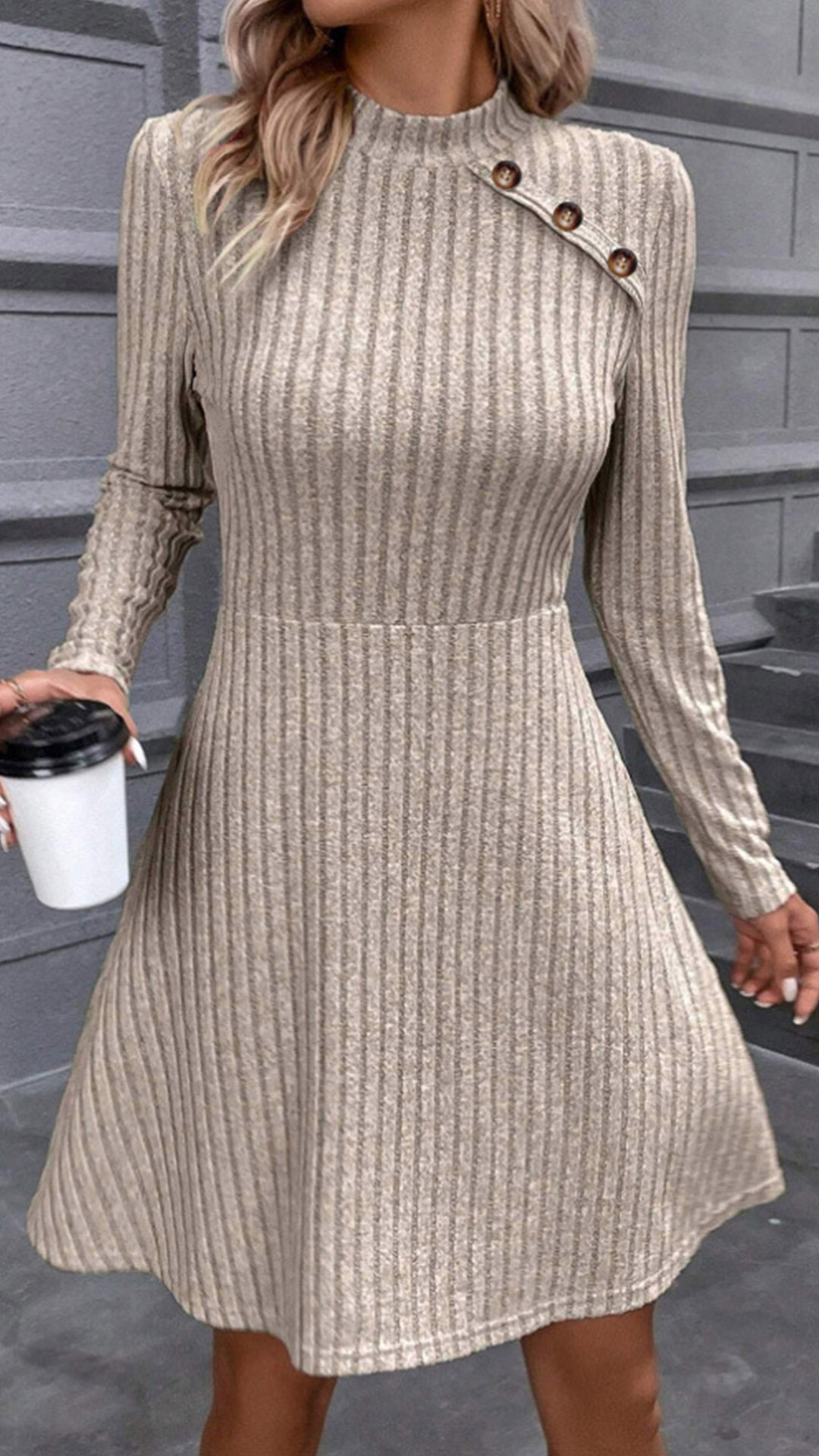 Elegant Mock Neck Long Sleeve Buttoned Ribbed Dress