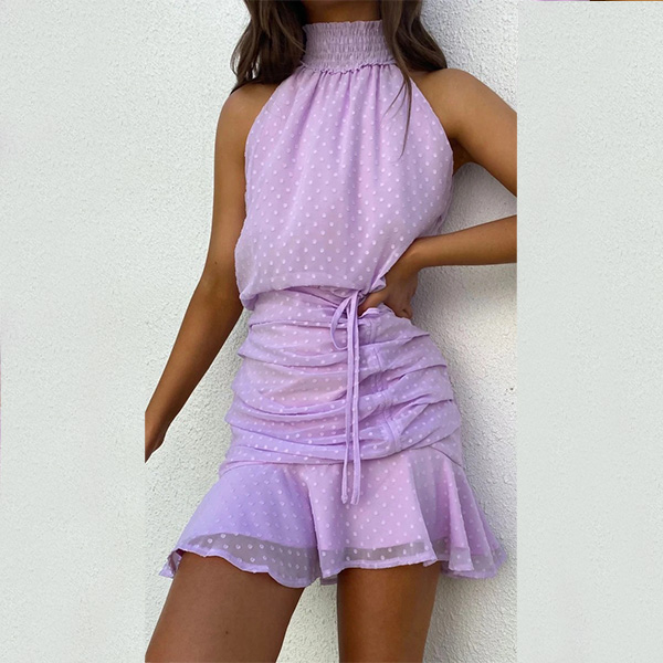 This elegant dress features a mock neck, sleeveless design, front ruched detailing, and a ruffled hemline for an elegant and feminine look. Is it your style?