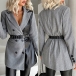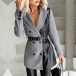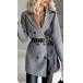 Elegant Notch Lapel Long Sleeve Double Breasted Artificial Leather Spliced Duffle Blazer with Belt