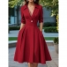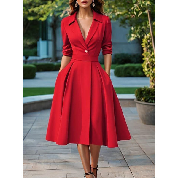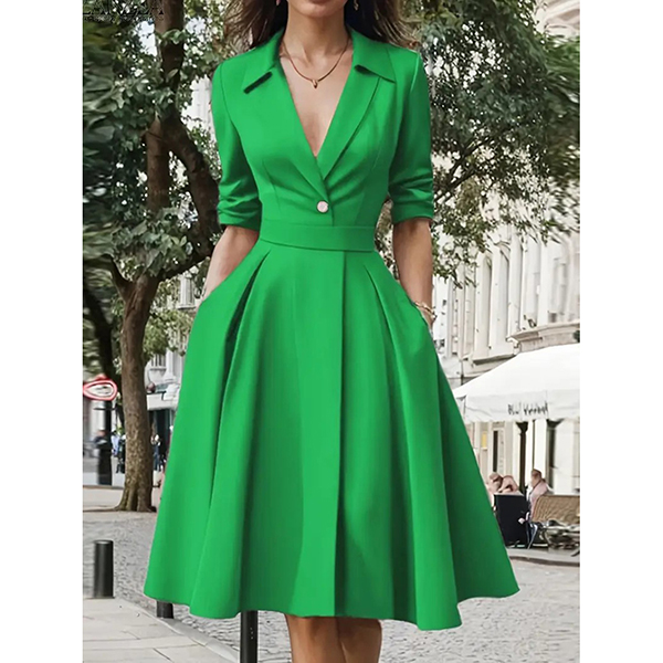 Elegant Notch Lapel V-neck Elbow Sleeve High-rise Midi Dress