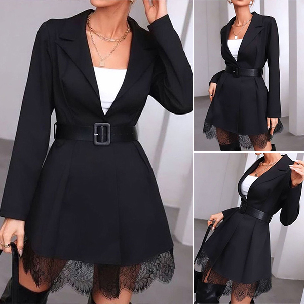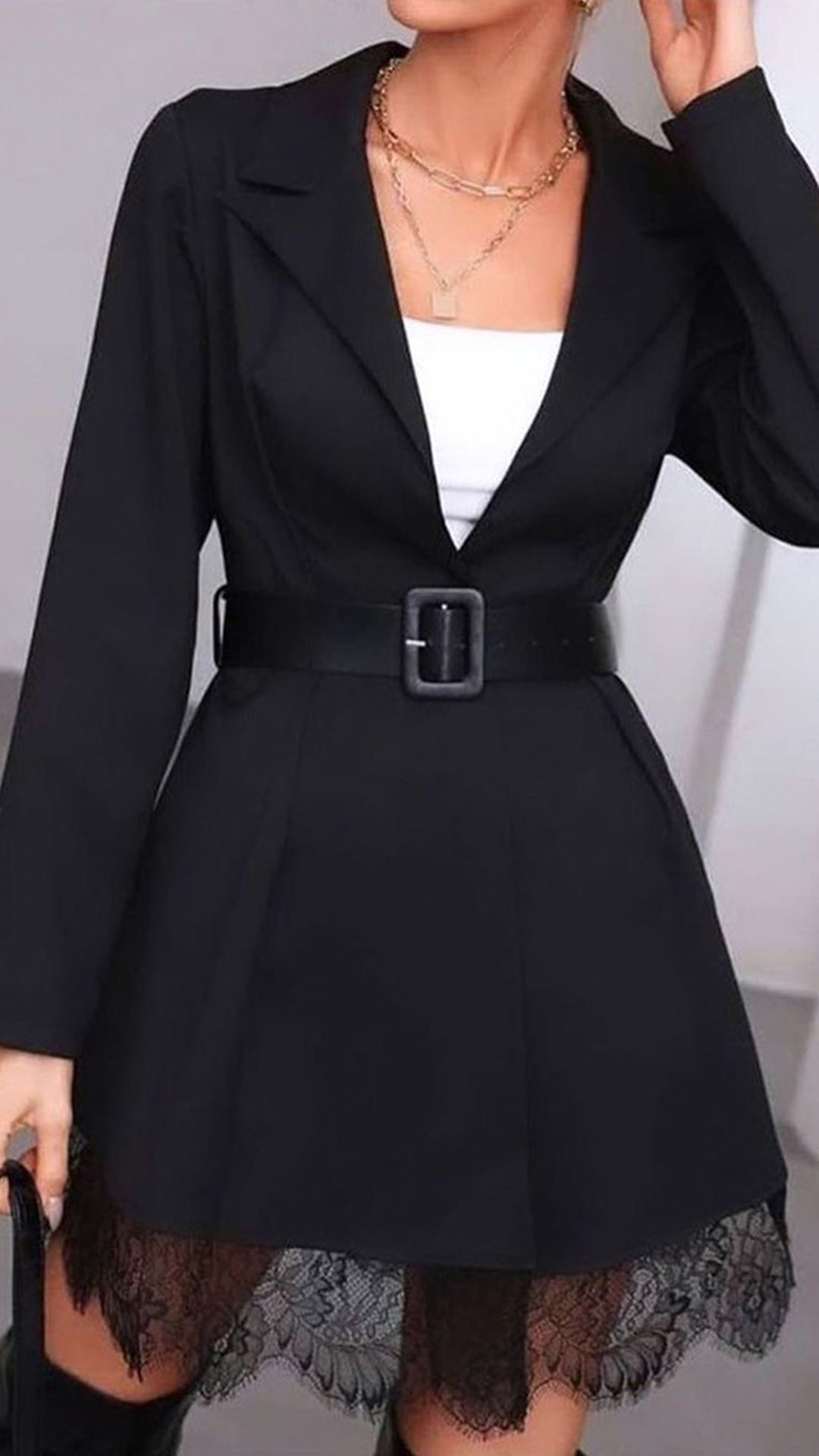 This elegant dress is a stylish and sophisticated dress that is perfect for any formal occasion. It features a classic notch lapel and v-neck design, which adds a touch of elegance and sophistication to the overall look. The long sleeves and lace spliced detailing hemline provides a delicate and feminine touch, while the included belt cinches at the waist to create a flattering silhouette. This dress is perfect for weddings, cocktail parties, or any other formal event, and can be paired with heels and statement jewelry to complete the look. Wanna have one?