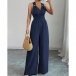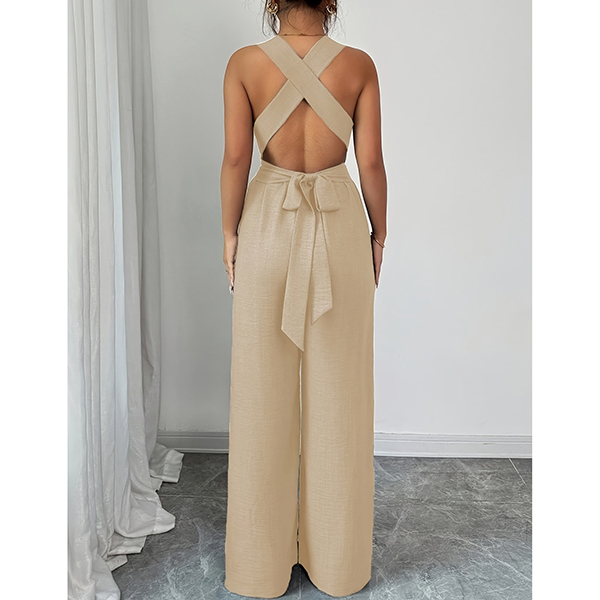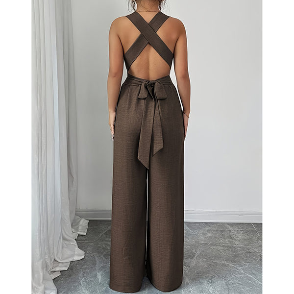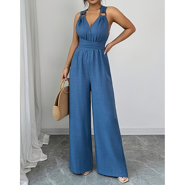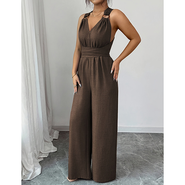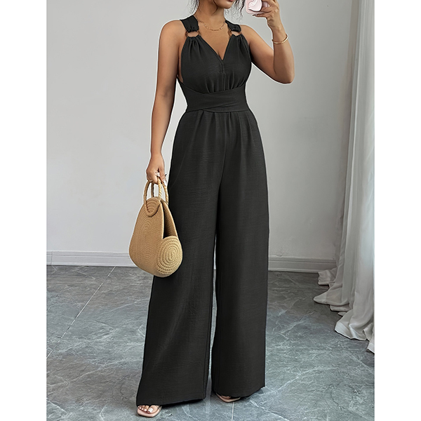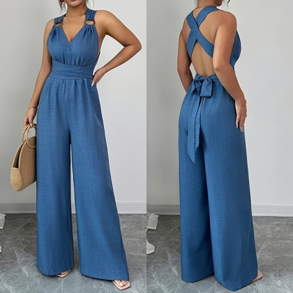 This jumpsuit features striking O-ring styling with flattering V-neck design and romantic tie-back bow construction for contemporary elegant sophistication. Multi-colors available.
