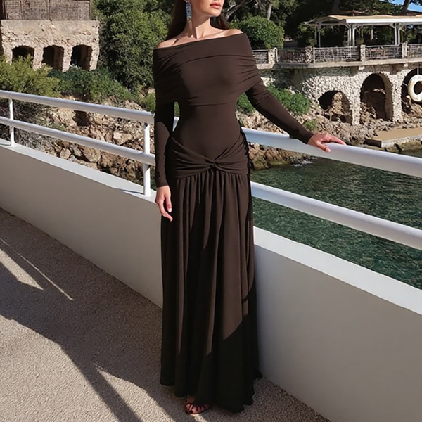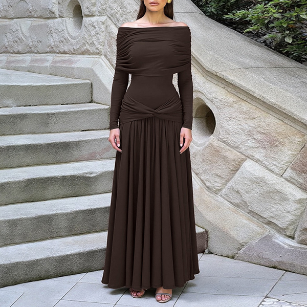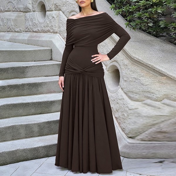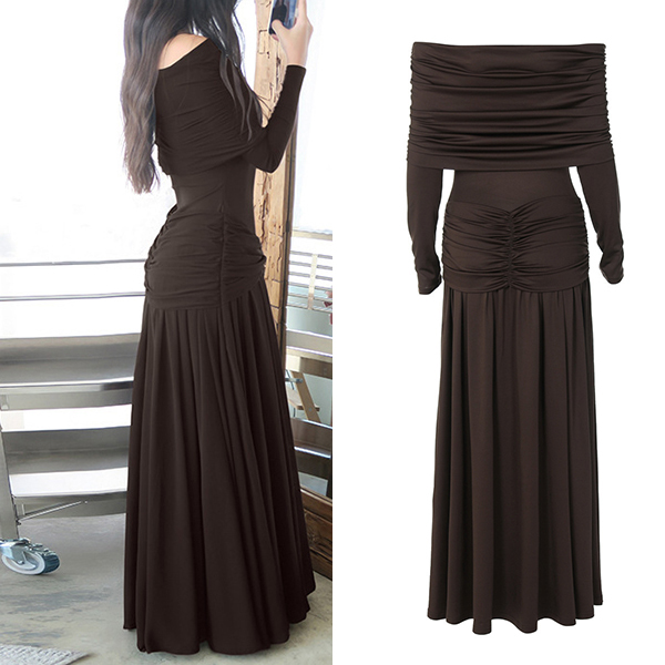 This romantic dress features off-the-shoulder styling with sophisticated ruched detailing and graceful maxi length for contemporary elegant sophistication. Perfect for elegant occasions, romantic styling, or sophisticated formal wear.