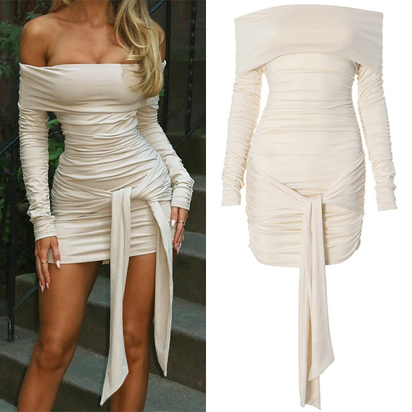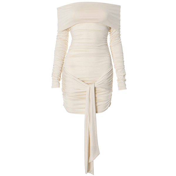 Elegant Off-the-shoulder Long Sleeve Ruched Self-tie Bodycon Dress